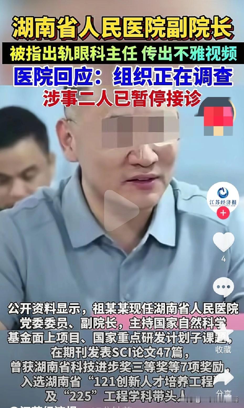 湖南医院这两位资深医学专家,就因为一次“深入”的交流被停诊了。 医学界从此会不会痛失两位顶尖人才,还未可知。 不过祖某某的这个学科带头人,估计是没机会再做下去了。 作为医生如果私生活混乱,如果不被爆出来,如果不影响自己的专业水平,甚至不影响患者的治疗,还有一线生机。 而作为人才培养的带头人,就算是传业授惑的老师了,要传授的可不只是专业知识,如果品行有问题,那么他就将不再有机会了。没有几个人,愿意跟着一个生活糜烂的老师去求知吧。 还有那个眼科专家,是什么让她无所顾忌,放飞自我的,明知山有虎偏向虎山行,似有不入虎穴焉得虎子的气概。只是这次却羊入虎口了。 这么清晰的视频和照片外流,并且机位这么好,拍摄者的身份不能不让人怀疑,是因为私愤,还是为了正义。 总之,培养出来这么两个高端人才太难了,如果因为这些东西被清出医生队伍,对社会和家庭,都是巨大的损失。 工作和生活都不易,且行且珍惜吧! 湖南医院风波 湖南医院事件