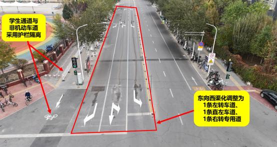 调整后,车道设置优化为:1条左转专用车道、1条直行专用车道、1条右转专用车道,非机动车道更改至慢行道,实现机非分离,非机动车道与人行道中间护栏隔离。