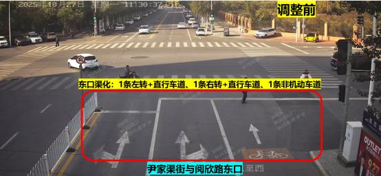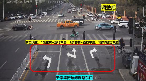 为进一步优化该路口交通组织,减少车流交织冲突,保障道路交通安全畅通。银川交警根据路口交通流量以及交通管理的实际需要,对尹家渠街与阅欣路东口的车道渠化进行了调整。