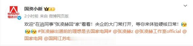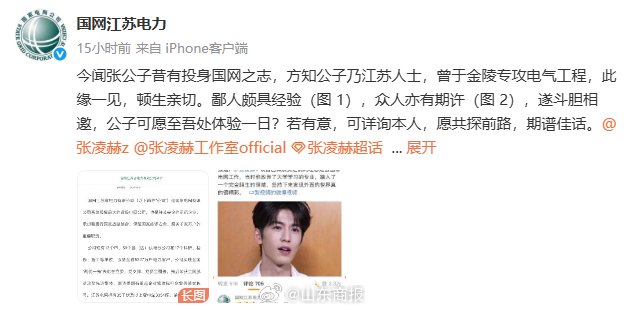 #多家央企邀请张凌赫就职##多家央企回应张凌赫#11月6日,“江苏电力回应张凌赫”相关话题登上热搜。此后,多家央企纷纷下场回应演员张凌赫:可否愿意体验?斗胆相邀!国务院国资委官方新闻平台“国资小新”也下场邀请张凌赫。