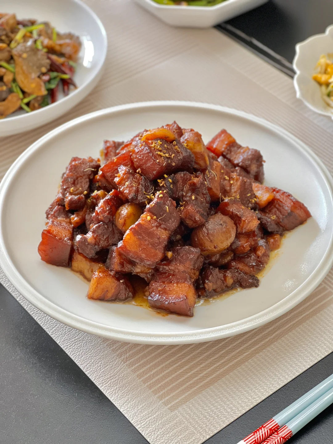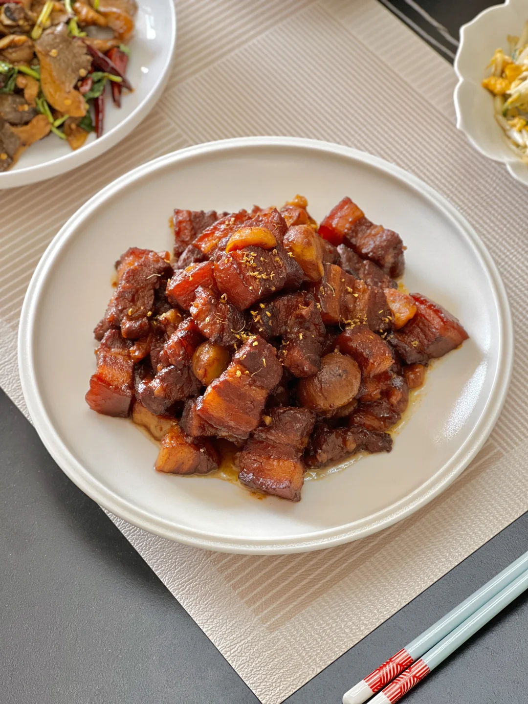 今天是平凡的家常菜,配一碗饭吃却是刚刚好~红烧肉剩几块也无妨,热一热和现泼的油泼辣子夹到馒头里,一口下去特别香,大家可以试试[偷笑R] 【板栗红烧肉】 【孜然炒平菇】 【腊肠炒蒜苔】 【鸡蛋炒豆芽】
