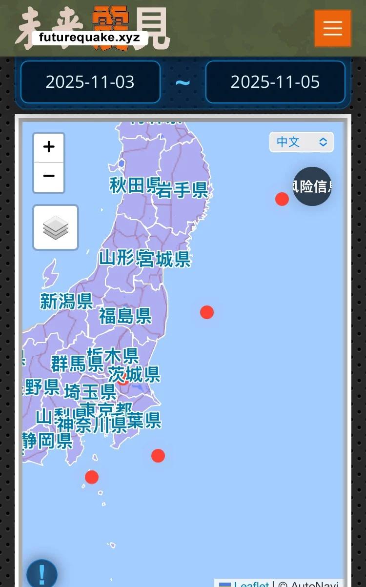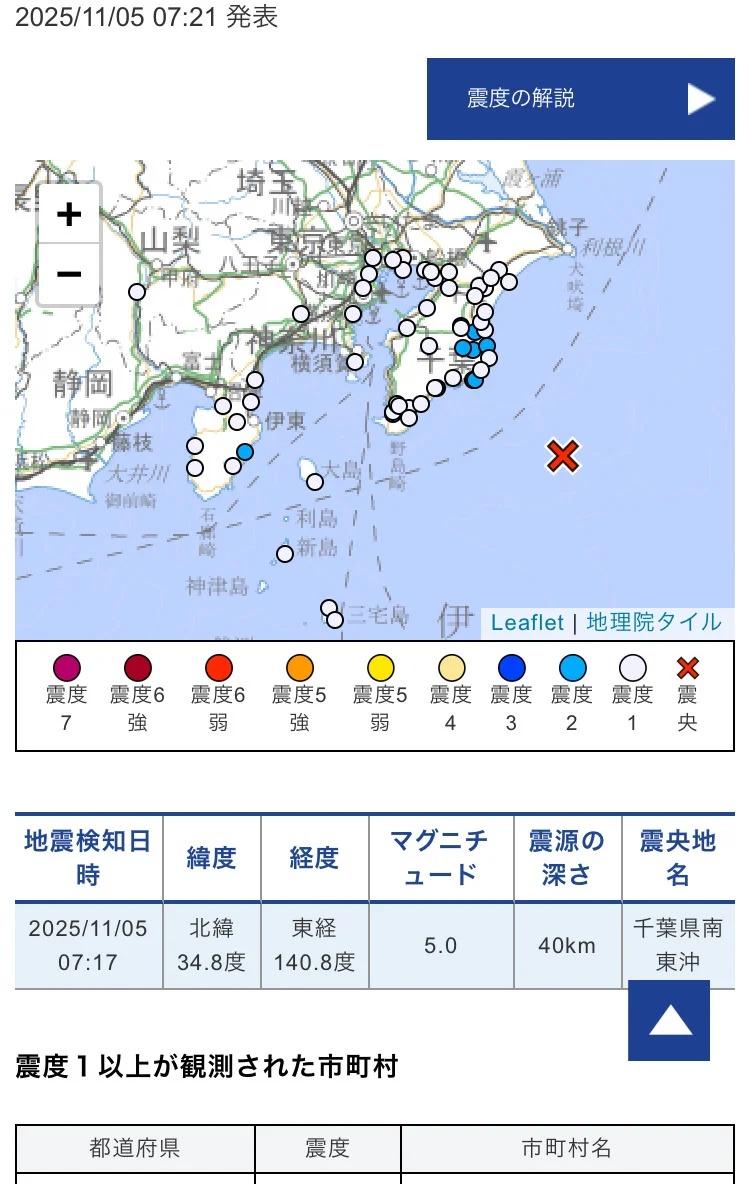 千叶县今早5级地震,关东至东北地震联动线 东京时间11月5日7时17分,千叶县外海附近发生5.0级地震,震源深度40公里。千叶县、东京都、神奈川县、静冈县有震感,最大震度2。震度并不高,但需注意千叶周边近期地震频繁且震级多在4级以上,尤其是和东北沿线地震有联动和应力转移迹象。 日本 日本灾难性地震指数 jceri 地震 日本地震 地震预测 千叶 东京 横滨