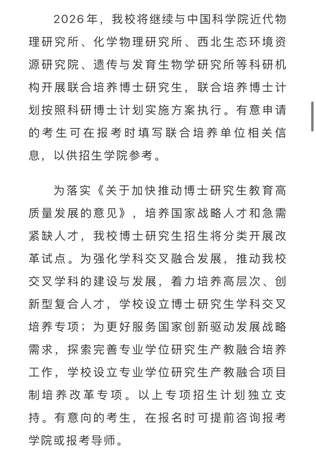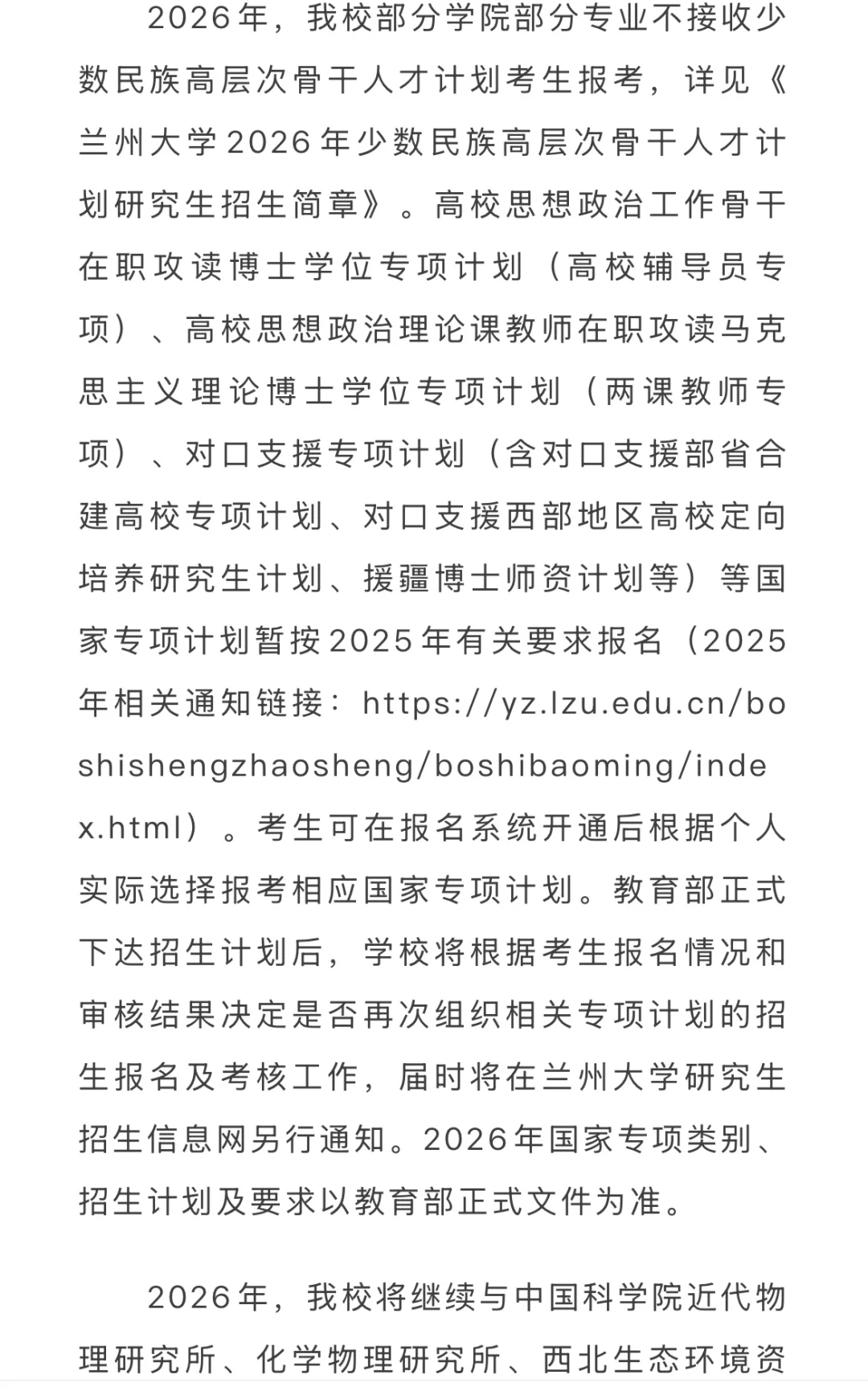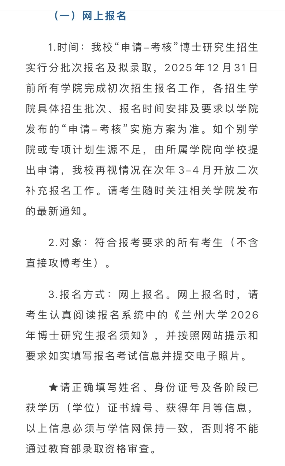兰州大学2026年博士研究生招生计划约2000人(含各类招生考试方式、所有专项计划),分为学术学位和专业学位两种类型,学习形式包含全日制和非全日制。最终招生人数以教育部下达的招生计划为准,各专业的具体招生人数由招生学院公布。 1.时间:我校“申请-考核”博士研究生招生实行分批次报名及拟录取,2025年12月31日前所有学院完成初次招生报名工作,各招生学院具体招生批次、报名时间安排及要求以学院发布的“申请-考核”实施方案为准。如个别学院或专项计划生源不足,由所属学院向学校提出申请,我校再视情况在次年3-4月开放二次补充报名工作。请考生随时关注相关学院发布的最新通知。