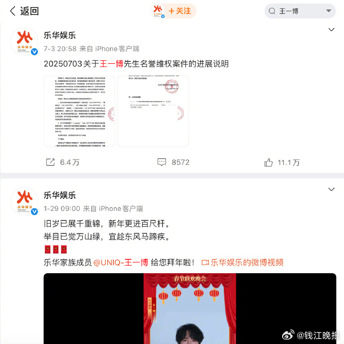 【乐华发王一博动态骤减】#王一博已成立个人独资工作室# 近日,曝王一博不续约乐华登上热搜,截至发稿前王一博方仍未回应相关热议。 在乐华娱乐账号查询王一博发现,其今年仅发了3次王一博相关动态,分别为维权案件和新春祝福,距24年13次动态存在明显差异。当前据网络信息显示,王一博名下已关联3家存续企业,其与王正兴分别担任股东身份,王一博多持股超60%。 #王一博[超话]#(扬子晚报)