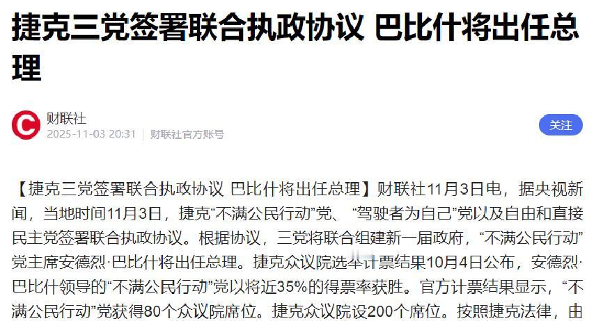 快讯!快讯!。 捷克总统府突然宣布了三党已签署联合执政协议,安德烈·巴比什拟出任总理。 10月4日,捷克统计局公布众议院选举最终计票结果,巴比什领导的“不满公民行动党”拿到近35%的得票,稳居第一。 11月3日,“不满公民行动党”与“驾驶者为自己”党、自由和直接民主党正式签字结盟,三方敲定组建新一届政府的路线。 总统府随后发布联合声明,新班子上来后的优先事项之一,就是重新评估对乌援助方向和力度。 这和此前执政联盟的做法明显不同。过去两年,捷克在能源价格走高、通胀压力不小的情况下继续推进对乌援助,内部争议一直存在。 公开资料显示,捷克此前规划的军事与经济支持,多次在议会讨论中遭遇质疑,财政承压与民意分歧叠加,推进节奏放慢。 把目光拉远,类似声音在区域内并不孤立。匈牙利总理欧尔班长期对援乌持谨慎态度,其阵营在国内选举中维持稳定。 时间往前推一个月,斯洛伐克议会选举里,主张调整援乌方式的力量取得优势,随后在组阁谈判中发挥关键作用。 这些结果叠加到一起,意味着欧洲内部对援乌的同向推进正在松动,不同国家开始按自身节奏重新审视。 回到捷克新联合政府,最现实的考题是两条线并行:一条回应国内的物价与财政压力,一条处理对外协调与沟通的不少细节。 自冲突爆发以来,欧洲多国承受能源和通胀的叠加冲击,居民与企业端都在压缩成本,这直接影响对外投入的空间。 如果更多国家调整节奏,乌克兰获得的物资与资金可能出现时间差与规模变化,这会传导到前线与后方的安排。 接下来一段时间,欧洲内部的选举与组阁还会继续,若冲突维持当前态势,援乌议题可能在更多场合成为分水线。 这次捷克的变化,就是一次清晰信号:区域内的态度正在转向务实,把账算清、按能力出手。 最终还是看执行。新政府具体怎么评估、怎么落地,数据会说话,节奏会说明问题。
