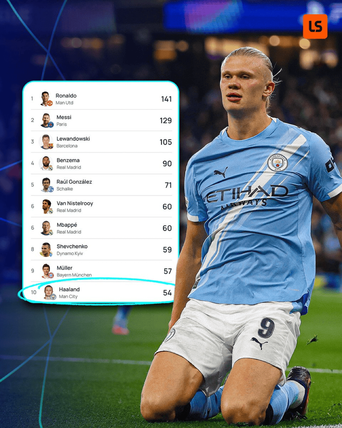 挪威前锋成为曼城队史首位连续五场欧冠联赛都有进球的球员,他目前已经收获了54个欧冠进球,排名赛事历史射手榜第十位。