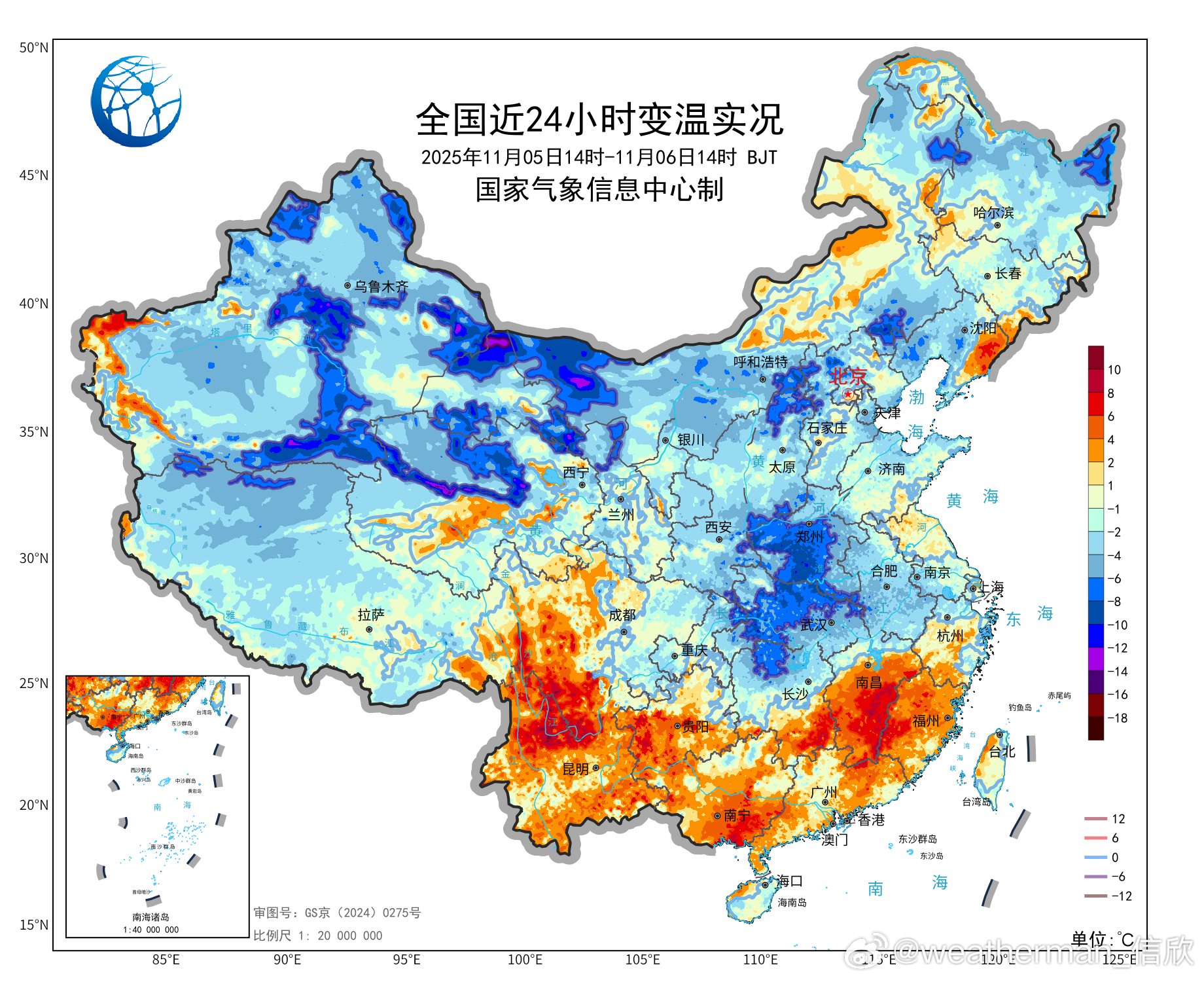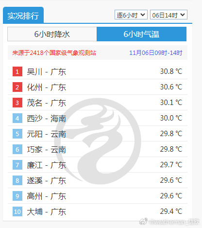 【气温】今天长江以北多地,因为冷空气或者天空状况不佳、光照减少,导致降温。新疆巴仑台降12.4℃、甘肃民乐降10.8℃,为各自省区14时降温最强站点。而长江以南多地,光照较好,气温回升。广东吴川、化州、茂名超30℃,位列气温榜前三。