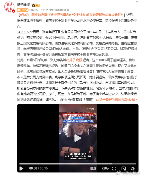 樊馨蔓表示:张纪中质疑的不是具有报案材料的“湖南美猴王公司”,张纪中质疑的是公安经侦受理案件的能力,张纪中太下流太恶劣了,且不说他对公司做下的事情,以后公安和法律会裁定;他怼网友的下流恶劣,充满污秽乱伦,他为自己粉饰的虚伪早就破散一地。不知张纪中面对樊馨蔓提供的证据,又该作何反应?
