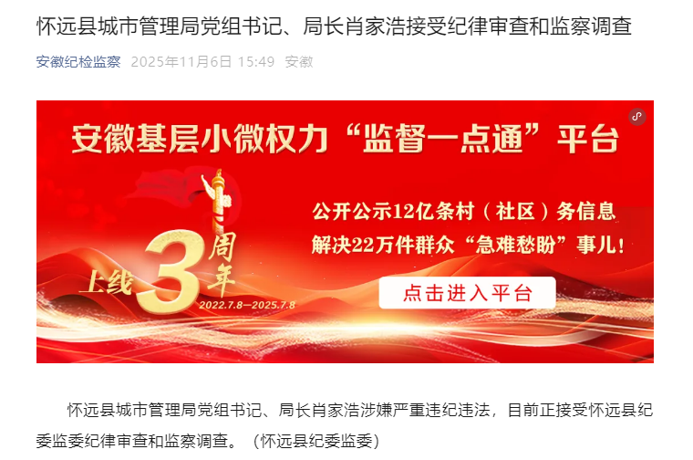 安徽怀远县城市管理局党组书记、局长肖家浩涉嫌严重违纪违法,目前正接受怀远县纪委监委纪律审查和监察调查。(怀远县纪委监委)