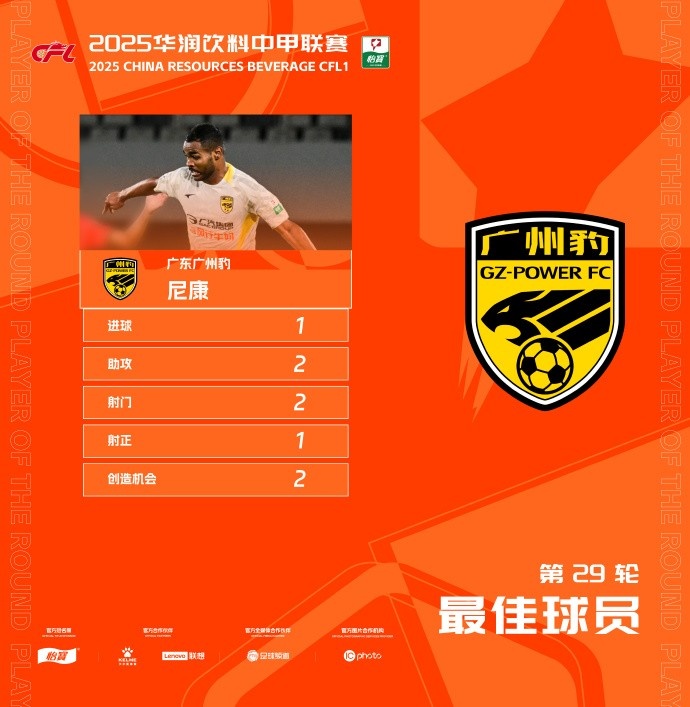 直播吧11月6日讯官方消息,广东广州豹中场尼康当选中甲第29轮最佳球员。