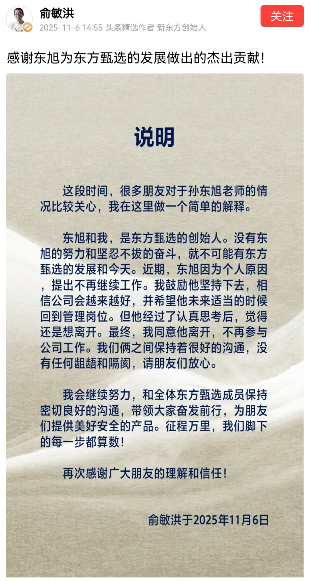 东旭和我,是东方甄选的创始人。没有东旭的努力和坚忍不拔的奋斗,就不可能有东方甄选的发展和今天。近期,东旭因为个人原因,提出不再继续工作。我鼓励他坚持下去,相信公司会越来越好,并希望他未来适当的时候回到管理岗位。但他经过了认真思考后,觉得还是想离开。最终,我同意他离开,不再参与公司工作。我们俩之间保持着很好的沟通,没有任何龃龉和隔阂,请朋友们放心。