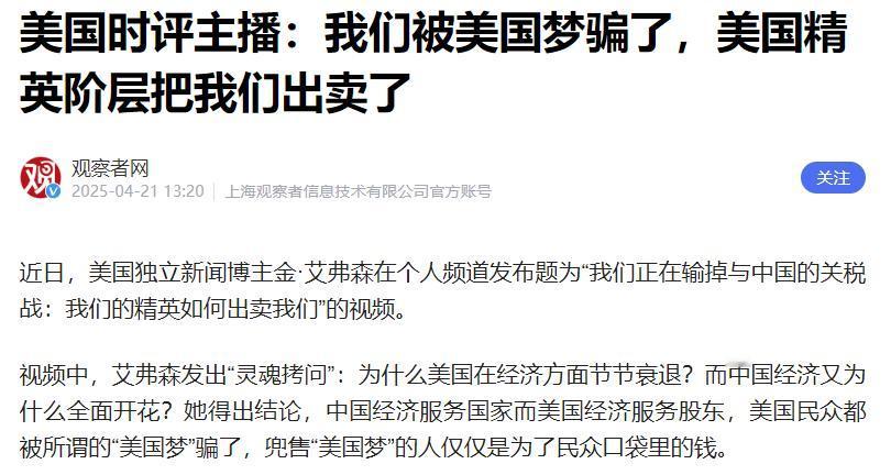 美国一名美女主播一句话捅破窗户纸,她表示:中国在为中国而战,而美国的统治阶层在为自己的利益行动,所以,真正的问题不在于中国在“作弊”,而在于我们被那些向我们兜售“美国梦”的人欺骗了! 美国独立新闻博主金·艾弗森的这句话,在美国的社交平台中疯狂传播,越来越多美国人开始反思,曾经深信不疑的美好愿景背后。 美国土木工程师协会给自家基建评了个C级,这居然还是近30年的最高分,要知道其中39%的主要道路处于"差"或"一般"状态,7%的桥梁存在结构性缺陷,就像一件打满补丁的旧外套,看着就让人揪心。 而中国新能源乘用车在2024年4月的世界份额已经冲到了67%,插电混动车型更是占到全球71%,这种碾压式的优势是我们把国家发展和民众需求真正绑在了一起。 美国铁锈地带的工厂一栋栋关门时,华尔街的金融大鳄们还在为季度财报欢呼,通用汽车把工厂搬到海外的同时,高管们的年薪却涨了两位数。那些曾经能让工人养活全家的高薪岗位,就这样变成了资本账本上的"冗余成本"。 反观中国的光伏产业园,从硅料到组件的全产业链布局,不仅解决了大量就业,还让清洁能源走进了寻常百姓家。这就是区别,一边是精英们盯着K线图计算收益,一边是把"绿水青山就是金山银山"刻在发展纲领里,谁真正在乎老百姓的饭碗,答案不言自明。 加州高铁项目堪称美国基建困境的缩影,2008年喊着330亿美元2020年完工,结果花了150亿连轨道都没铺好,预算还膨胀到1350亿,最后连联邦政府都懒得给钱了。 而我们的高铁,从无到有再到世界第一,只用了十几年时间,这种执行力背后是"集中力量办大事"的制度优势,而不是政客们为了选票画的大饼。 得州洪灾时民众在水里挣扎,联邦政府却忙着取消防洪项目拨款;纽约暴雨淹没地铁站时,维修预算还不知道卡在哪个党派的提案里。当中国的特高压电网在崇山峻岭间架起,当光伏板铺满西部的戈壁滩,美国的石油巨头们还在拿着政治献金游说议员,阻止新能源政策的推进。 美国新能源渗透率常年徘徊在9%左右,欧洲也才16%,而中国已经达到38.2%,这背后不是什么运气,而是把民众出行成本、环境治理和产业升级拧成了一股绳。 那些兜售"美国梦"的精英们,自己住着带私人电站的豪宅,却让普通民众在寒潮中因为电网崩溃冻得瑟瑟发抖;他们一边指责中国发展太快,一边把本国的基础设施搞得像第三世界,这种双重标准说白了就是利益作祟。 毕竟修高铁赚不了快钱,建光伏不如卖石油来得直接,在资本主导的游戏里,老百姓的死活从来都不是优先级选项,这就是金·艾弗森捅破的那个残酷真相。