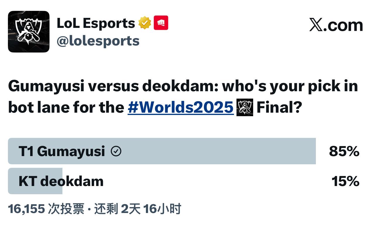LOL官方发布决赛下路对位投票:Gumayusi以85%得票率获胜