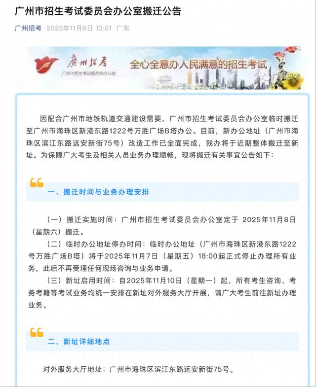 市招考办此前使用的临时办公地址(广州市海珠区新港东路1222号万胜广场B塔)将于2025年11月7日(星期五)18:00起正式停止办理所有业务,此后不再受理任何现场咨询与业务申请。