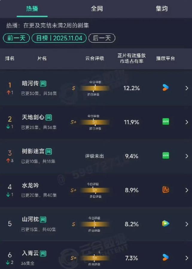 龚俊《暗河传》云合登顶了! 成毅的《天地剑心》云合登顶几天之后,龚俊的《暗河传》终于超过成毅的《天地剑心》云合登顶了,两大男主的剧虽然播的都很一般,但好在谁也没有被谁甩开很远,不至于差距太明显。