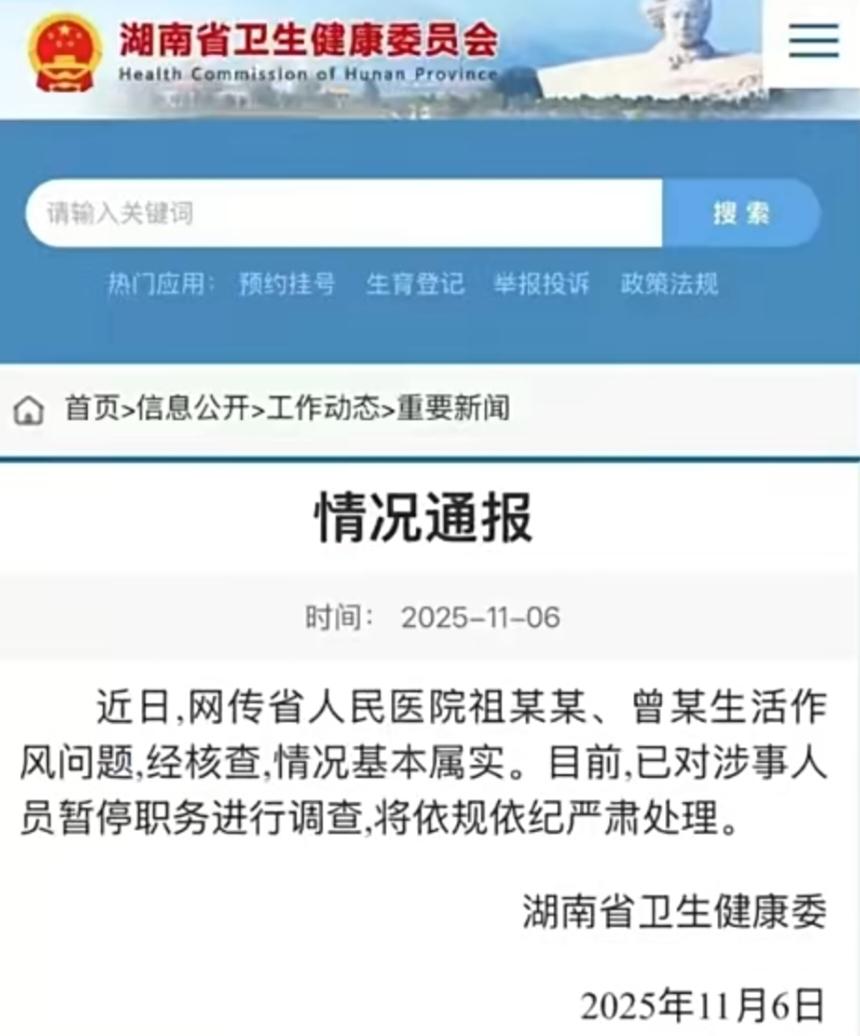近日,网络流传湖南省人民医院相关人员存在生活作风问题的消息。经核查,该院党委委员、副院长祖雄兵,眼科副主任、眼科一病区主任曾琦涉及的相关情况基本属实。目前,两人已被暂停职务,正接受组织调查,后续将依据相关规定和纪律予以严肃处理。 此前,有报道指出祖雄兵(时任副院长)与眼科主任医师曾琦被指存在不正当关系,且有不雅视频流出。对此,湖南省人民医院工作人员曾回应,组织正在开展调查,相关情况可联系医院宣传部门了解;当地卫生健康委员会则表示,暂未收到相关信访反映。11月6日,大河报记者在该院挂号页面查询发现,祖雄兵、曾琦的预约挂号均显示“暂无号源”。 公开资料显示,祖雄兵曾主持国家自然科学基金面上项目及国家重点研发计划子课题,在期刊发表SCI论文47篇,荣获湖南省科技进步奖三等奖等7项奖励,同时入选湖南省“121创新人才培养工程”及“225”工程学科带头人;曾琦擅长复杂玻璃体视网膜手术、白内障及眼外伤治疗,以第一作者或通讯作者身份发表SCI及核心期刊论文20余篇。