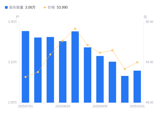 日期A股户数(户)流通A股户均持股数(股)户均持股市值(万元)2025-10-103103115522.4986.582025-09-303131115383.6785.262025-09-193173915176.2385.842025-09-103253314805.8487.352025-08-293204915029.4385.972025-08-203225514933.4482.392025-08-083222914945.4978.542025-07-313254614799.9276.692025-07-183197715063.2777.302025-07-103167315207.8578.18
