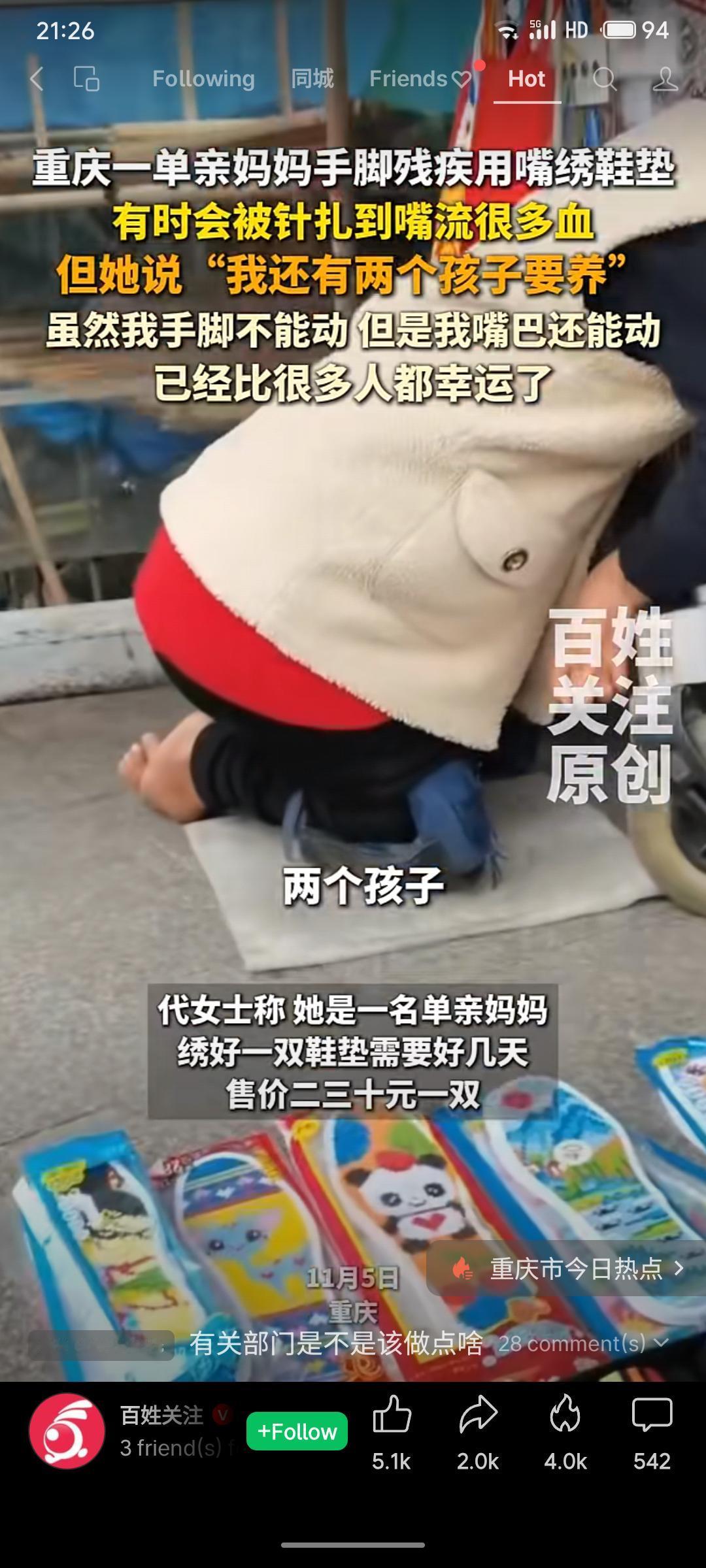 重庆一位手脚残疾的单亲妈妈代女士,为抚养两个孩子,每日坚持用嘴刺绣鞋垫谋生。她常被针扎致嘴部流血,绣好一双鞋垫需数日,仅售二三十元。其自强不息的事迹感动众多网友,大家纷纷转账支持。她表示:“虽然辛苦,但为了孩子从未想过放弃。”