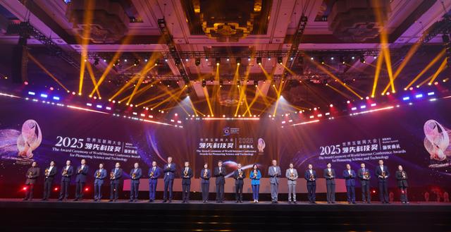 世界互联网大会领先科技奖颁奖仪式,CHIPX院长、图灵量子创始人金贤敏上台领奖(右六)