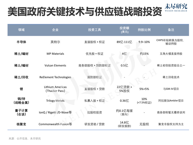 这轮国家安全型持股最清晰的是半导体与关键矿产(稀土/锂/铜锌)链条;采用的工具以优先股/普通股+认股权证居多,并常与长期购销/价格底线/贷款配套,形成准主权型资本约束。量子计算处于政策风向与资本试探期,尚未官宣持股比例。核聚变仍是非股权型支持为主(拨款、贷款、采购承诺),短期内不排除转向战略小额持股的可能。