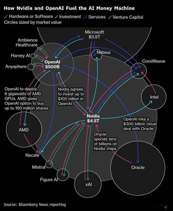 这把游戏也不是OpenAI独自能玩起来的,人们联想到了背后的“主谋’英伟达,它正在成为整个AI基础设施的最大的受益者、GPU的垄断者,以及AI技术革命的加速者,也可能扮演最后的救助者。黄仁勋在创造一种强大的叙事,从物理AI到生命科学,人类对于算力的需求将是无限的。他用英伟达这几年赚取的暴利,在大模型、物理AI、机器人、生物科技、能源科技、芯片设计、材料科技等领域大举风险投资;通过向客户贷款融资、投资和提供最新GPU,扶持新云企业,创造需求并制造短缺;投资它的老对手英特尔;最终投资了OpenAI千亿美元,这笔钱将用来购买GPU。黄仁勋从买铲子的人,变成了宇宙就是计算的导演和诗人。