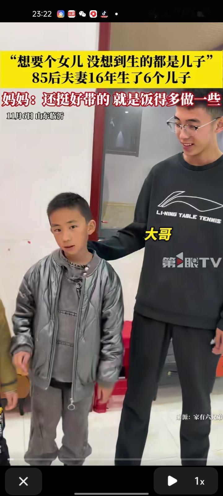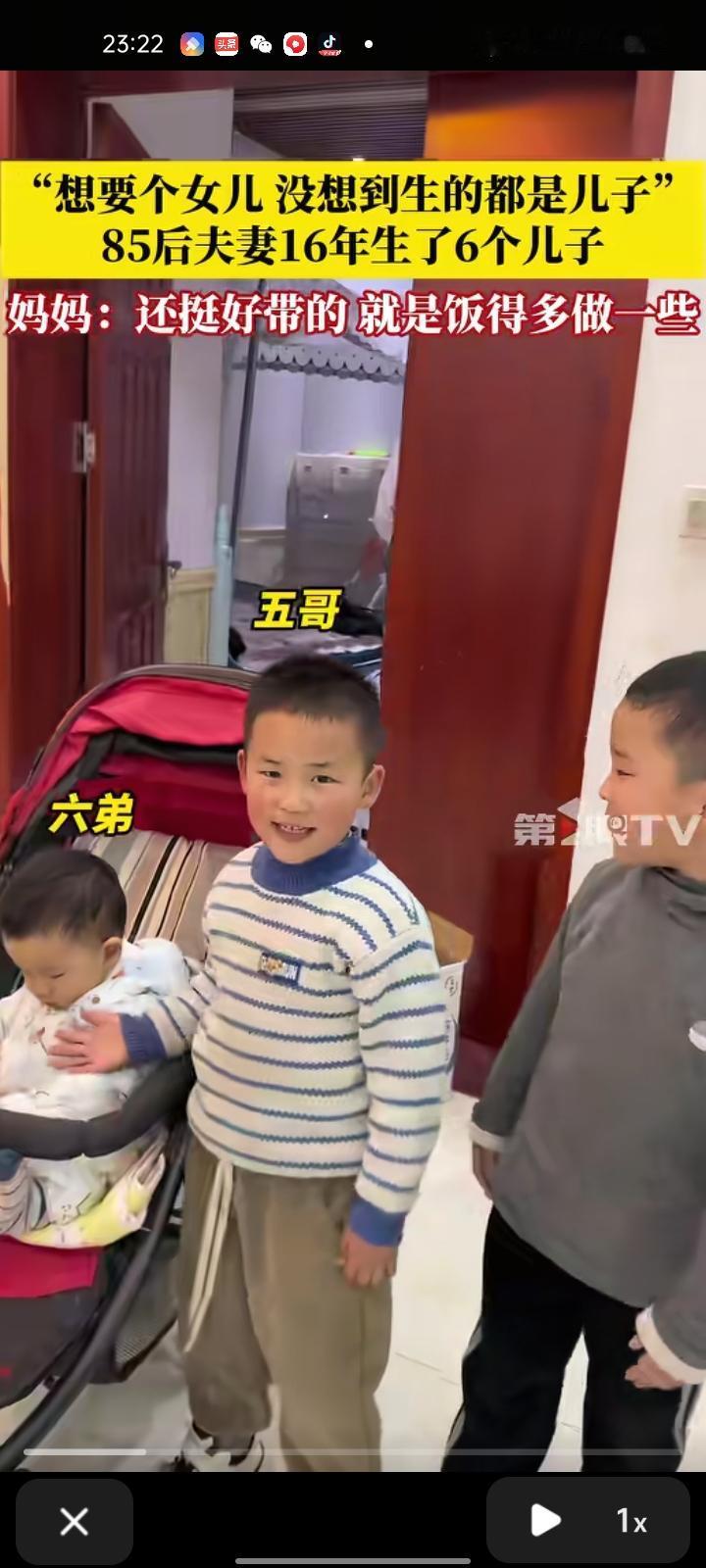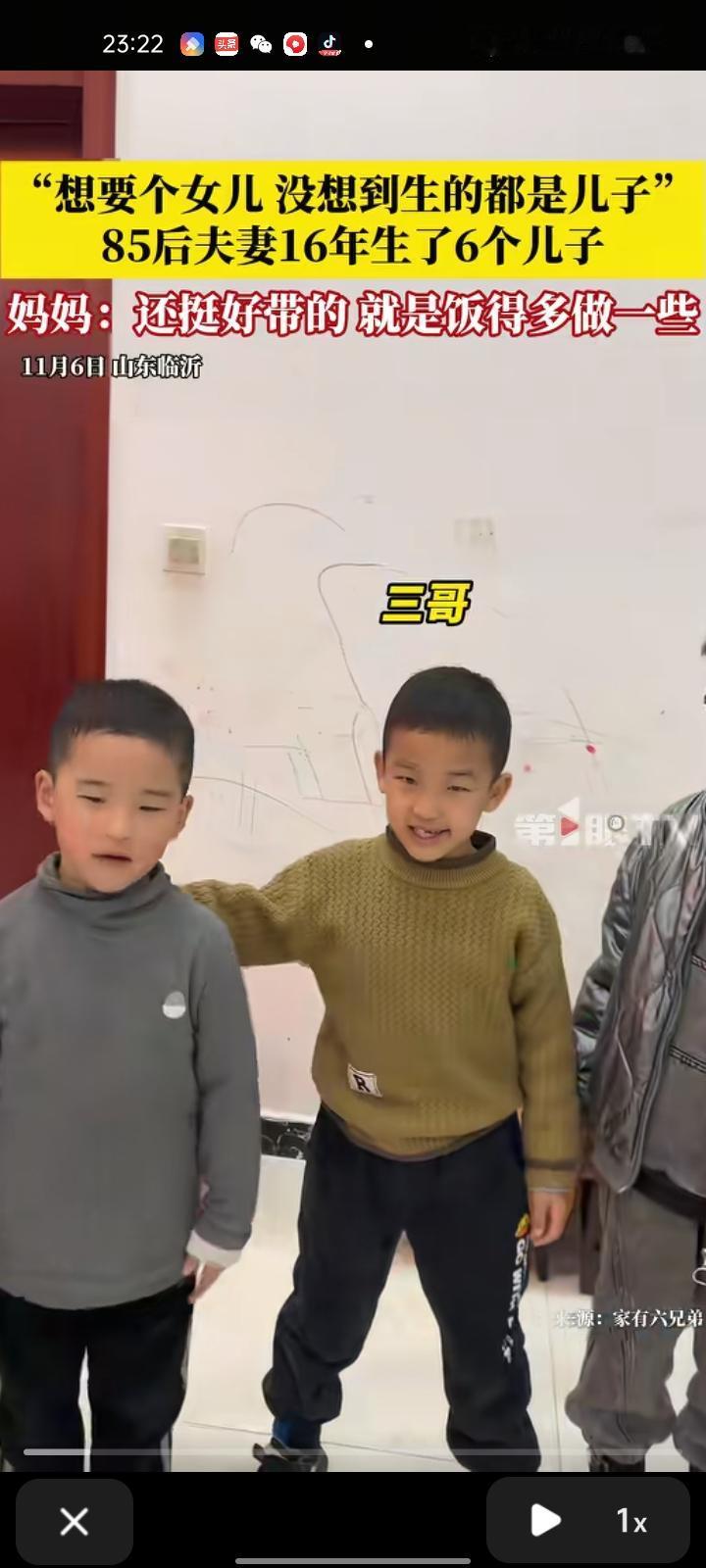 11月6日,山东临沂。85后夫妻16年把“追女梦”过成“男子汉天团”日常,张女士今年38岁,丈夫贾先生39岁,他们在2013年结的婚,六个儿子分别是2008、2017、2018、2020、2021、2024年出。张女士表示,虽然照顾儿子会花很多精力,但他们既然出生了,就是父母生命中最美好的礼物。现在也不会为他们长大后的彩礼焦虑,没必要为未来没有发生的事情焦虑,过好现在的生活就好了。 在当下的社会环境中,生育两三个孩子是比较普遍的选择,像这样养育六个孩子的情况比较少见,这背后需要夫妻双方在时间、精力、经济等多方面的巨大投入。每个家庭的生育选择都有其自身的考量和境遇,无论是少生还是多生,只要能用心经营家庭、给予孩子足够的关爱,让生活充满温暖和希望,就是值得肯定的生活方式。 当然,多子女家庭的养育也面临着更多挑战,比如孩子的教育资源分配、家庭经济压力调节等,相信这对夫妻也有着自己的应对方式,祝愿他们的 “男子汉天团” 能健康快乐成长,家庭生活始终充满欢声笑语。