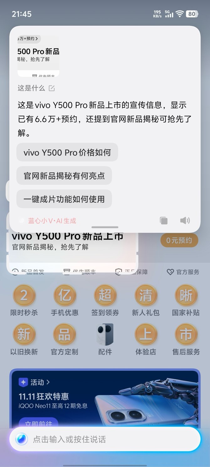 小V圈搜2.0采用全新交互形式,双指长按屏幕识屏,能智能识别屏幕内容中的关键元素并弹出相关操作按钮,实现从“识别”到“执行”的高效链路,覆盖高频使用场景。