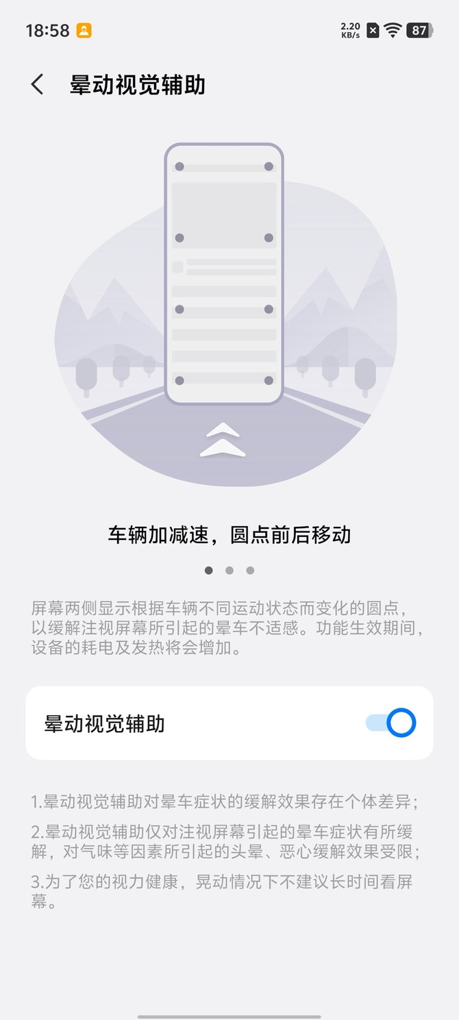 特别值得一提的是晕车视觉辅助功能,通过陀螺仪识别车辆运动方向和状态,屏幕两侧会显示跟随车辆运动的圆点,能有效缓解乘车时看手机的眩晕感,对于经常通勤的用户来说十分实用。不过该功能仅对注视屏幕引起的晕车有效,对气味等因素导致的不适缓解效果有限,且晃动时不建议长时间看屏幕。