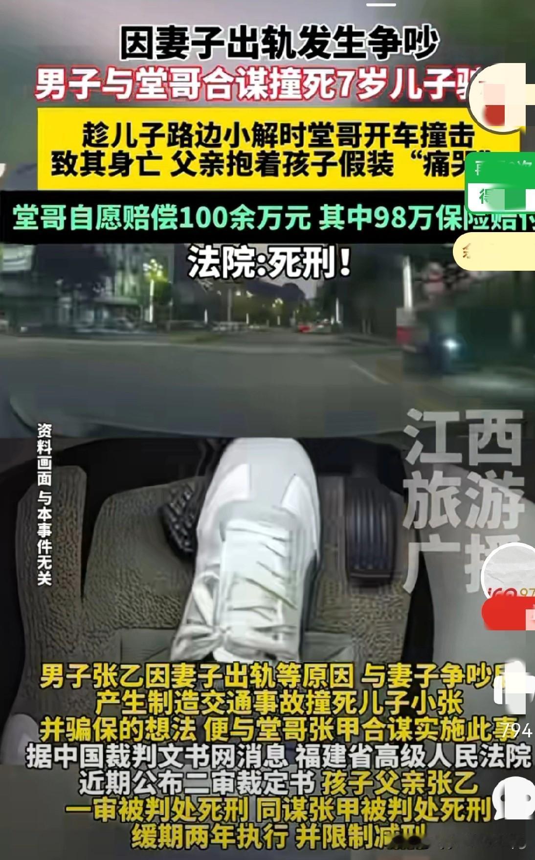 一男子,发现妻子出轨后,两人大吵了一架!之后,他竟然和自己的堂哥合谋,把自己的亲生儿子给…… 虎毒还不食子呢!可这个男人,却丧心病狂到如此的地步!他不但计划,让堂哥开车把自己的,亲生儿子给撞死,还要利用他的死,到保险公司骗保! 真是,禽兽不如的家伙啊!这个堂弟,也是个蠢货!人家指使他杀人,他就按计划执行!某天晚上,机会终于来了!这个男人特意带着儿子,外出到事发地点! 而这个堂哥,也早早就开着货车,埋伏到了那里!当孩子,独自去路边小便时,他一脚油门就向孩子撞了过去! 只听“呯”的一声响,可怜的孩子没搞懂,怎么回事呢!就被突然出现的,车子给撞飞了!并很快,停止了呼吸! 而他的父亲,却跑过去趁着夜色的掩护,在那里假模假样的,抱着孩子放声假“哭”!他的演技,也真是不错! 连奥斯卡,都欠他一个小金人!他不但骗过了路人,也骗过了保险公司! 既然是演戏,就得演全套!经调解,货车司机(堂哥)自愿赔偿,孩子父亲(男子既堂弟)100多万元,其中包括98万元的保险金! 然而,纸终究是包不住火的!事发一年多后,货车的车主罗某严重怀疑,当初开他车肇事的司机,和被害人有亲戚关系! 他有理由怀疑,这是一起撞死堂侄的“人为策划案”!当初,这对堂兄弟面对警察询问时,隐瞒了双方的亲戚关系! 所以,当车主向交警大队举报此事后!这起精心策划的,杀子骗保案也就真相大白了!近日,某高级人民法院公布,孩子的父亲被判处死刑! 他的同谋堂哥,被判处死刑缓期两年执行,并限制减刑!血债必须血来偿,这两个丧心病狂的人,终究没有逃过法律的制裁!“正义也许会迟到,但永远不会缺席!”