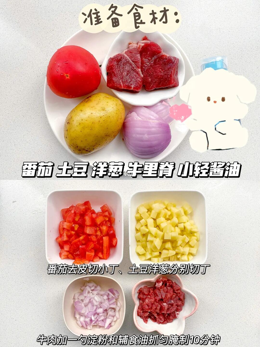 1⃣️蔬菜类全部切成小丁,牛肉切肉沫加一点淀粉和辅食油抓匀腌制10分钟,这样的口感更嫩。