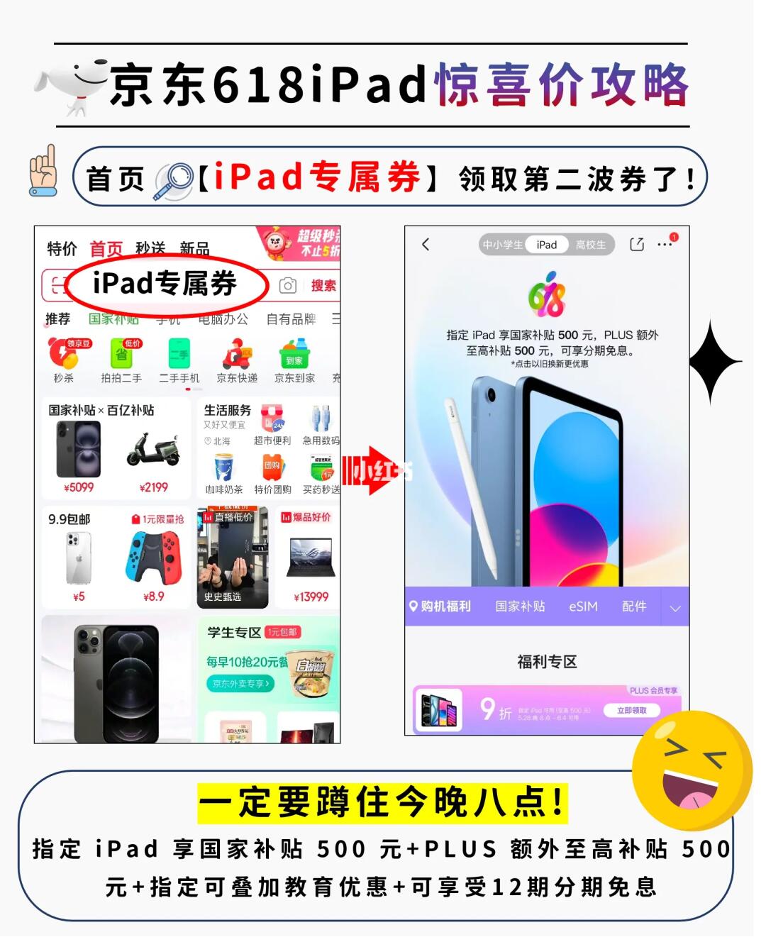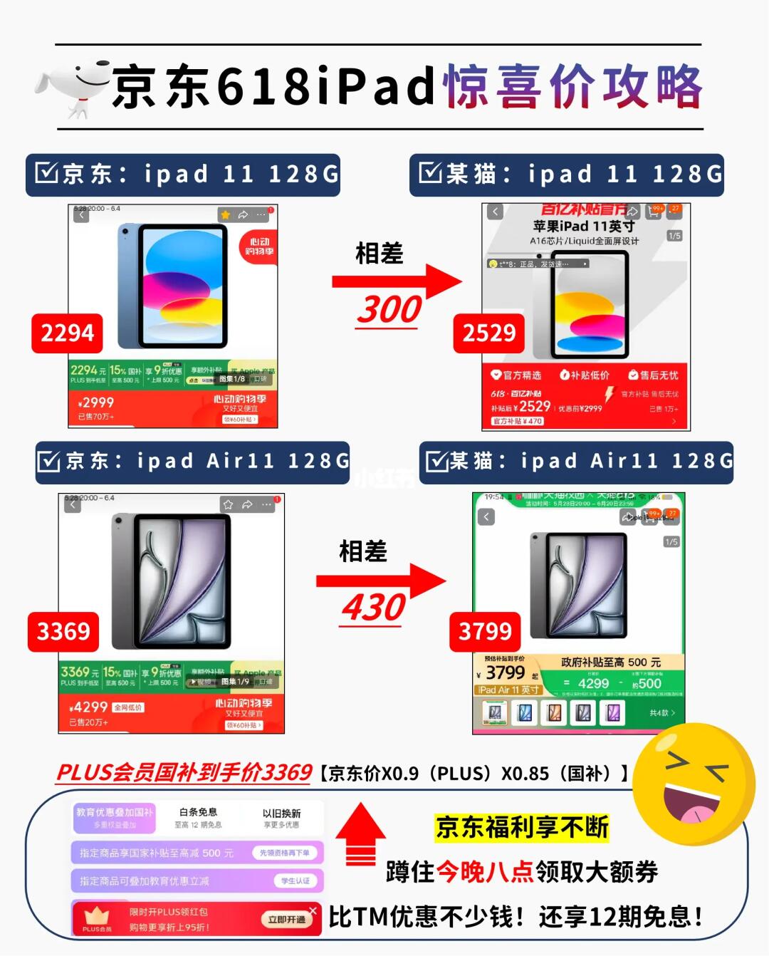 宝子们!捡钱时刻到!锁住今晚的八点! 京东PLUS会员国补大放血,两款热门iPad巨划算,学生党/打工人闭眼冲,错过真的亏哭😭 📍【iPad 11 128GB】 ✅ 原价2999|🐱2594 🔥 京东💰2294! 追剧/记笔记/轻度办公神器,性价比之王非它莫属! 📍【iPad Air 5 11 128GB】 ✅ 原价4799|🐱3809 🔥 京东💰3369! M1芯片+视网膜屏,画画/剪辑/玩游戏全hold住,生产力直接拉满💪 🔥领券怎么领? 1. 打开京东🔍【iPad专属券】 2. 一键领取PLUS会员专属券 3. 下滑领取所在地区国补(自动叠加!不用算破头) 4.  直接下单! 🔍 比价实锤!如果京东优惠是真的给力,与TM88vip对比简直不要太明显→ipad 11 128G在京东平台就优惠了三百大洋! 有一说一,这样比下来果然还是京东更便宜!想买的宝子赶紧冲! 蹲住今晚八点的闹钟!这波羊毛薅不到不知道要等多久啦!