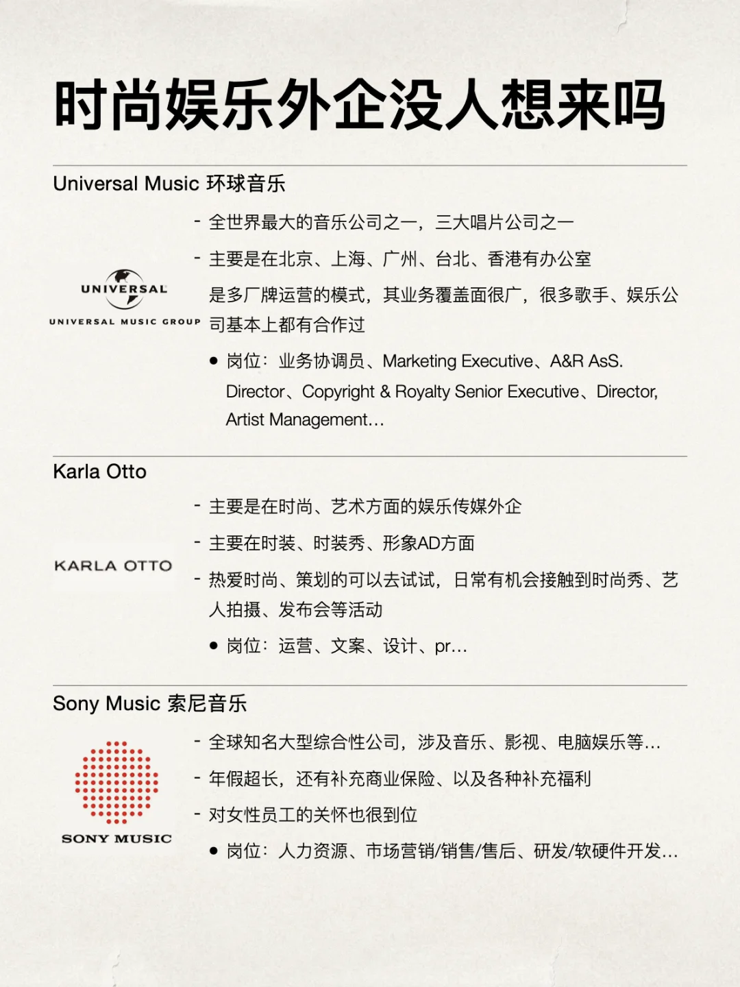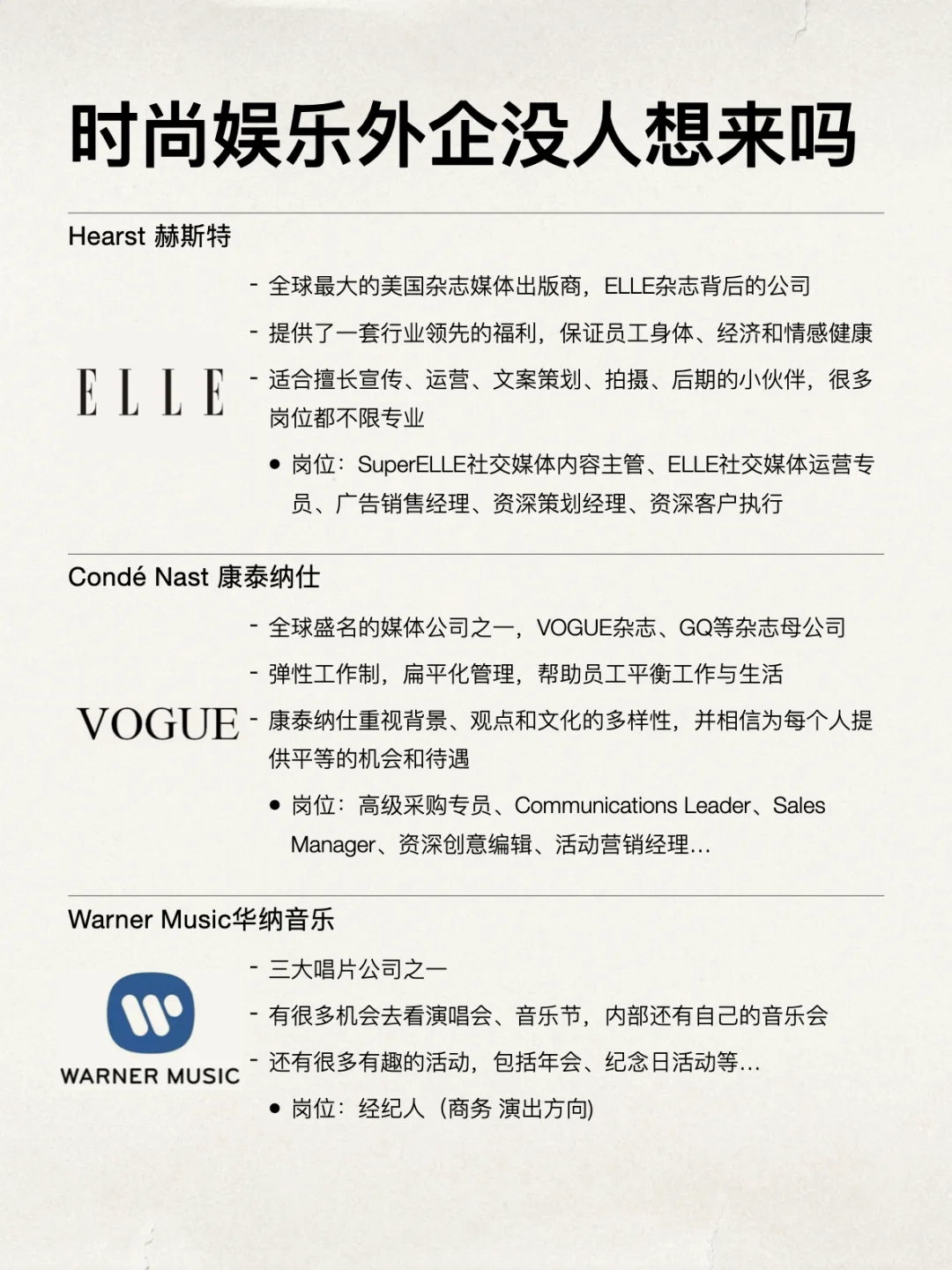 金九银十是进外企的黄金时间,尤其是又能追星又能接触时尚资源的娱乐时尚外企,香到离谱 . ✅标准955,超长年假,时尚品内购/明星同款抢先接触,团队氛围超好,全是懂梗的追星同好&时尚达人 ✅从顶流明星造型合作,到时尚大片的幕后制作,都能参与,一边接触偶像的时尚资源,一边对接国际大牌 ✅文科生&艺术生专业对口度拉满,传媒/设计/营销/策展/音乐/影视…不需要死磕技术,更注重审美和创意 . 坚持日更✊🏻,帮大家在找工作路上顺利拿到offer! .