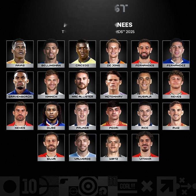 直播吧11月07日讯FIFA官方公布了2025年最佳阵容中场位置的候选,维蒂尼亚、贝林厄姆、佩德里等球员在列。