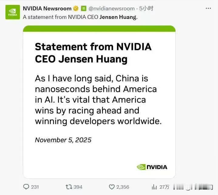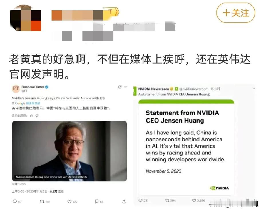 前几天说大空头重仓做空英伟达,果然英伟达股价这几天连续下跌,已经从高点的212美元跌倒目前的187美元,这些空头力量真大,说做空世界市值最高的公司,股价立马就跌,难怪黄仁勋这两天有点着急了,疯狂地表态中国将在和美国的人工智能的竞赛中胜出,其实潜台词就是告诉美国政府,让他把芯片卖给中国,一方可以让中国的AI公司依赖英伟达的芯片,一方面可以抢占中国国产AI芯片的市场份额,延缓中国AI国产芯片的发展,而且即使最后不能阻止中国AI的发展,起码让英伟达把这几年的钱给赚了,要不然怎么维持股价呢!所以黄仁勋着急啊,只能用这种负气的方式向美国政府传话!
