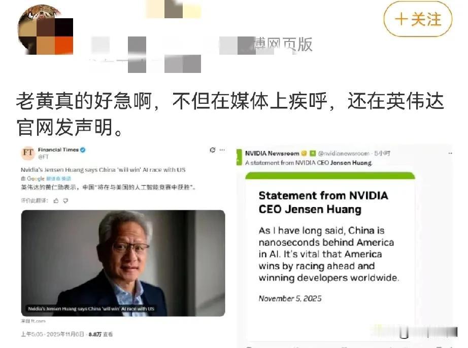 项立刚称黄仁勋再次要求卖芯片给中国被美国政府否决了,然后负气出走,跑到台湾宴请了几个台湾的芯片代工厂,然后在饭桌上说中国大陆AI会赢了美国,然后批评美国政府不让他卖芯片和其他错误的政策!其实黄仁勋不仅跑去台湾跟那几个芯片代工厂诉苦,还在美国媒体上疾呼,甚至在英伟达的官网上说中国将在和美国的人工智能的竞争中胜出!明显黄仁勋是非常着急,因为黄仁勋知道美国挡不住中国的AI,他想把这几年的钱给赚了,但是美国政府不让! 项立刚认为黄仁勋这样很危险,会得罪白宫的,马斯克是个白人,而且跟川普好得穿一条裤子,最后也是决裂了,而黄仁勋虽然也是美国人,但是一个华人而已,所以随时可能会被抛弃的。项立刚说得在理,反而没有黄仁勋,可以有个王仁勋或者汪仁勋,总之美国聪明听话的华人大把,又不缺黄仁勋一个!