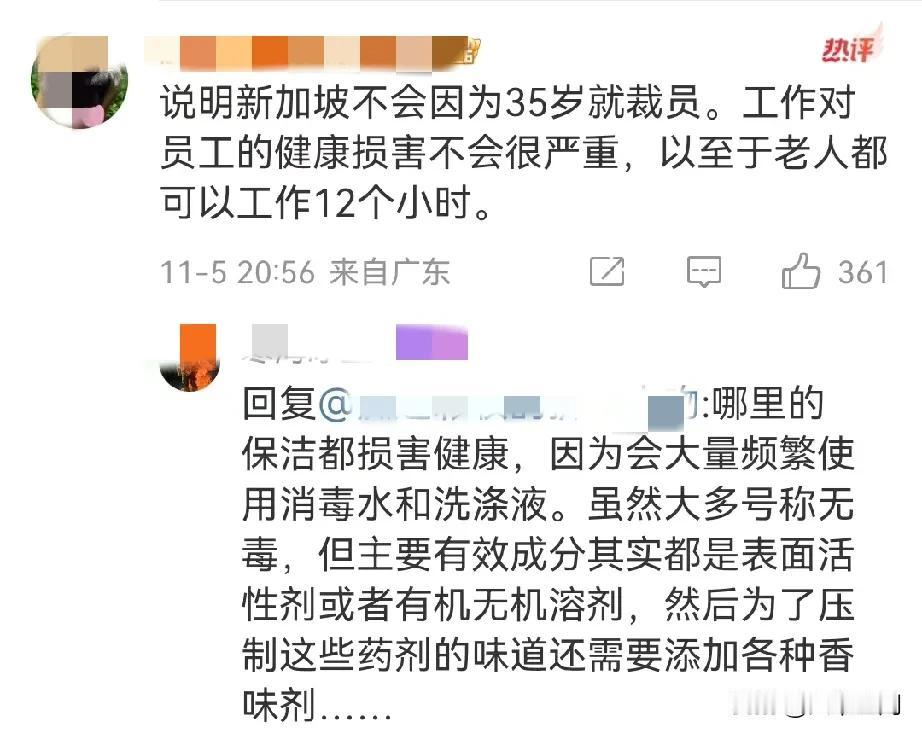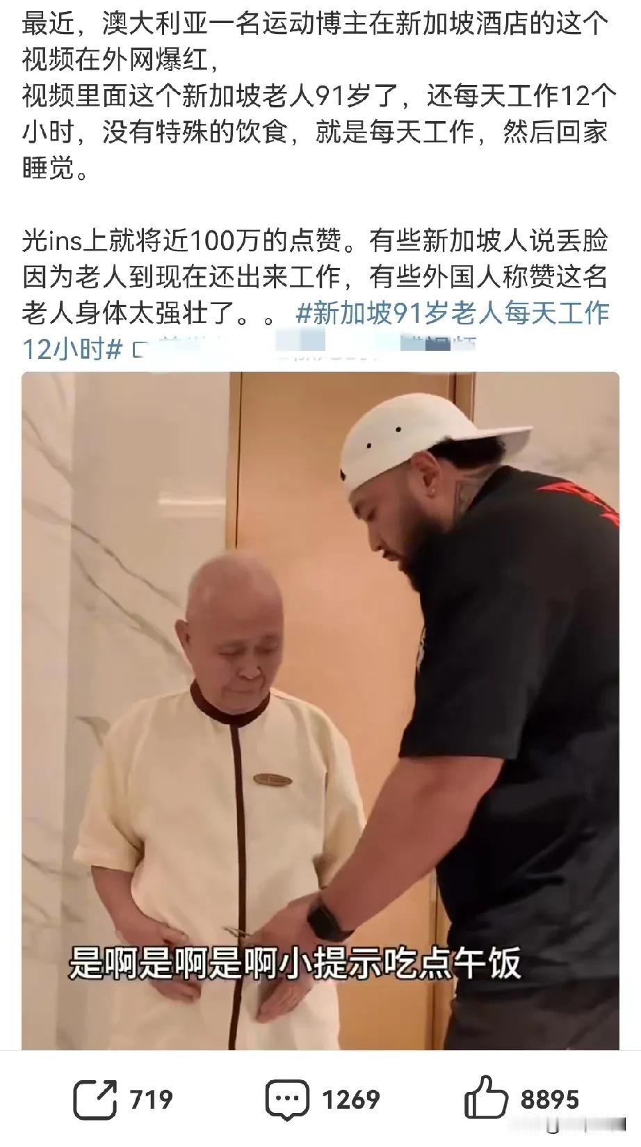 91岁的新加坡老人当保洁,每天上班12小时,从早上7点工作到晚上7点,每天就是工作回家睡觉! 然后评论区的画风是这样的,都在找各种角度吹捧,如果这个事情发生在国内,不知道它们要骂成什么样了!其实新加坡已经日本化了,日本大把七八十岁还在开出租车和公交车,还有各种百岁的仙人,为什么这么老还要工作,因为不工作,它真的活不下去,没有退休金,也怕子女嫌弃它们老了,给背到山上扔了,所以只能自己出来工作养活自己,直到自己死了!