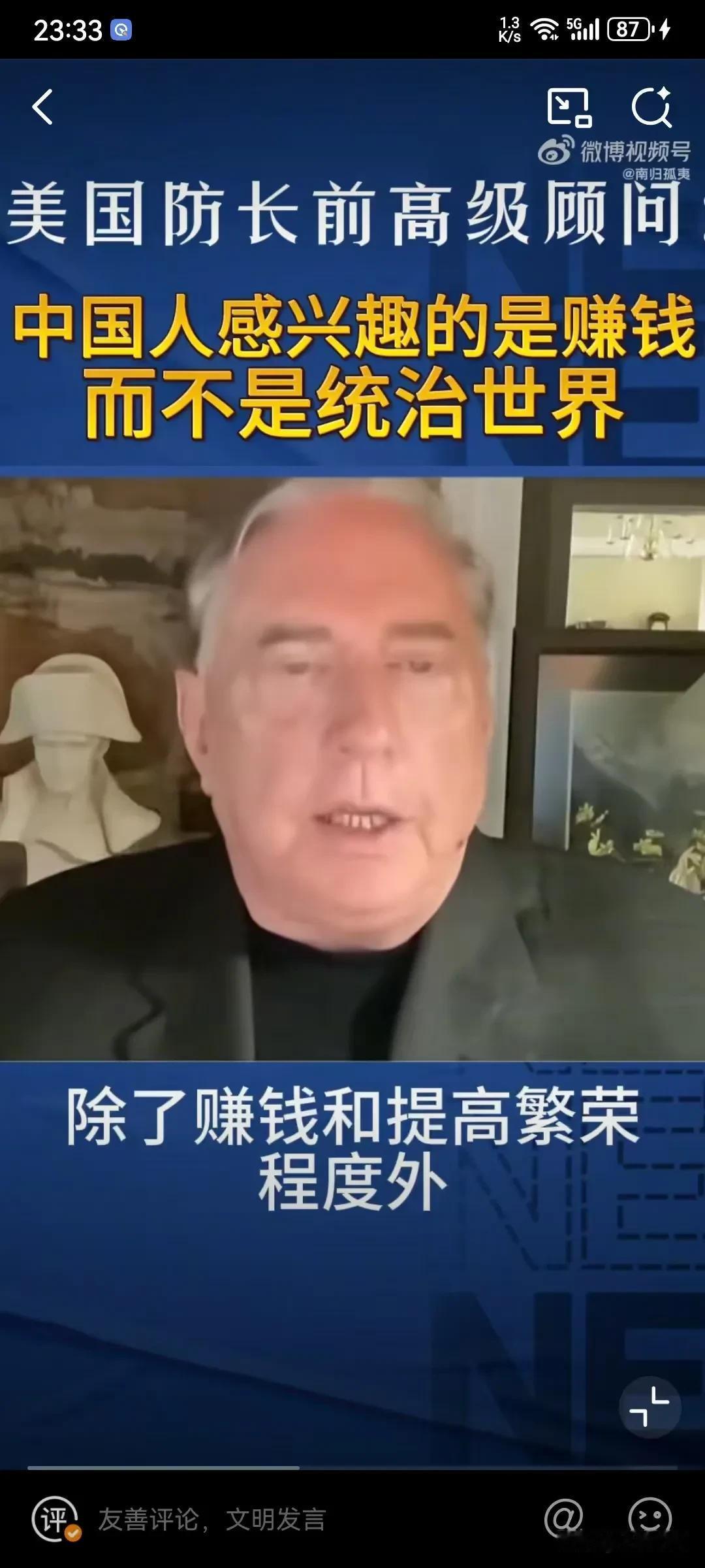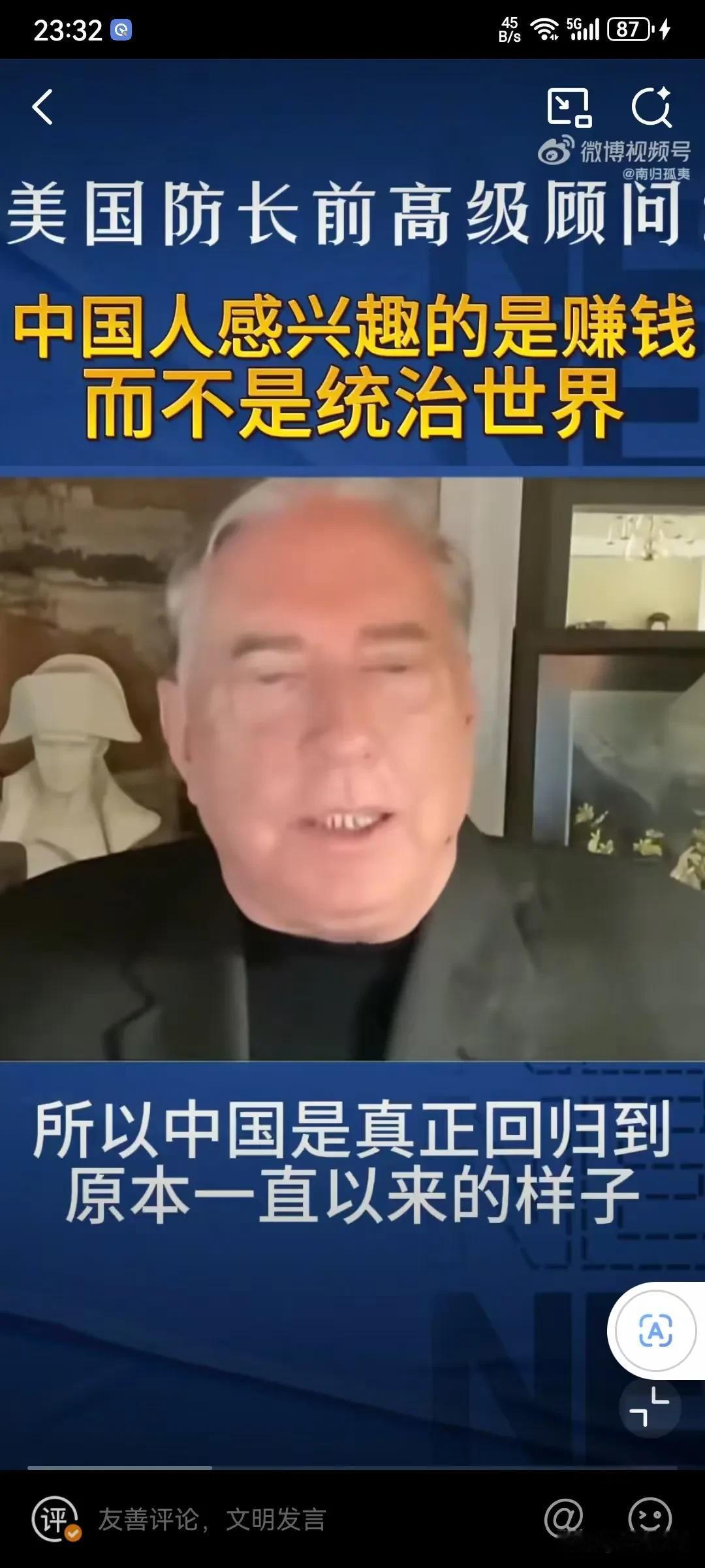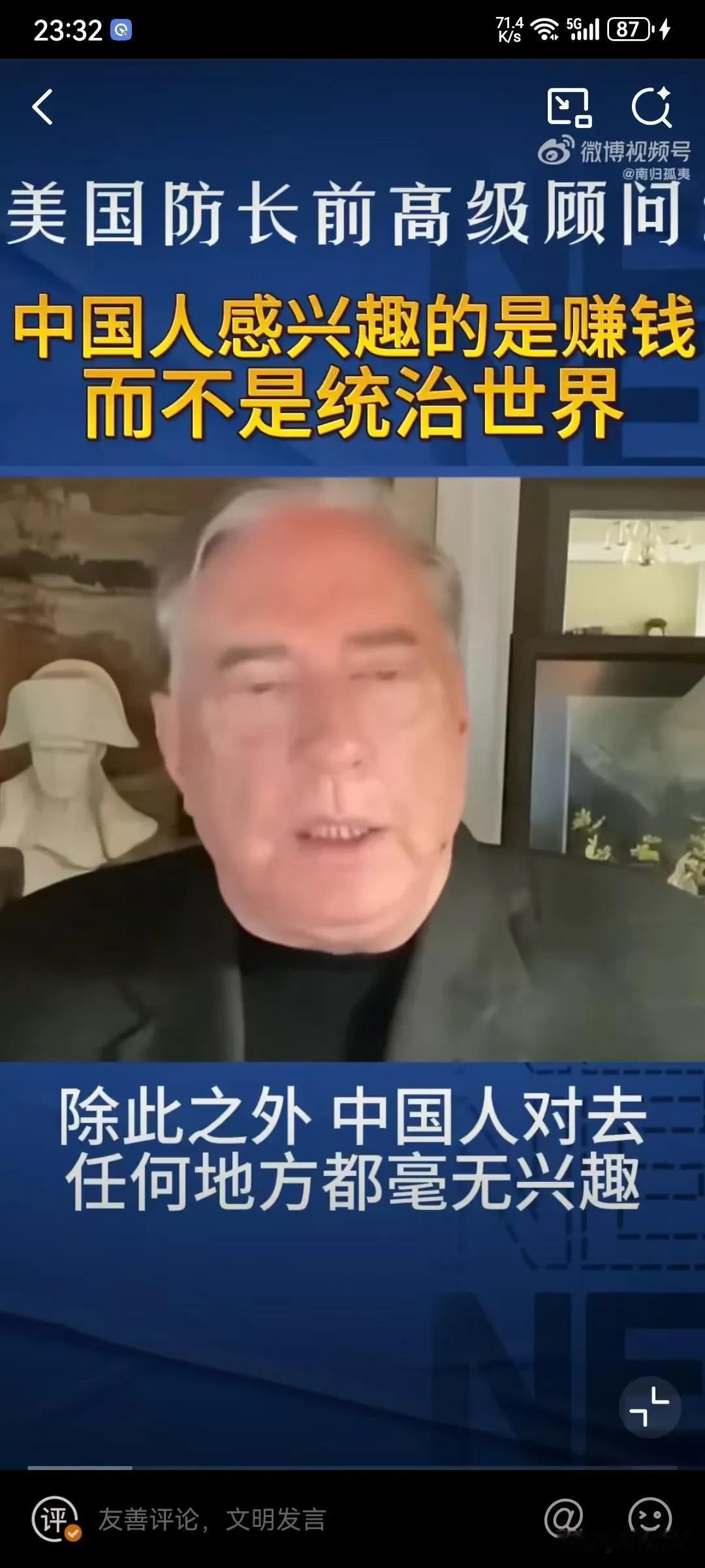 美国专家表示中国人对赚钱感兴趣,对统治世界没有兴趣,因为中国的历史唯一扩张的时期就是元朝,其他的时间都对其他地方没有兴趣,因为中国人本身就认为自己是世界的中心,所以叫中国,中国人只感兴趣于赚钱和保持繁荣! 这个美国专家还是比较懂中国历史的,其实中华文化并没有侵略性,要不然就不会建长城了,这本身就是一种防御性的思维,从秦朝大一统后,就开始这种这种思维,已经根深蒂固了,并且认为四周都是蛮夷,根本不屑于去占领,而且靠文明来融化,你向往我的文明和发达,你自己慢慢融合进来!就这样发展起来的!