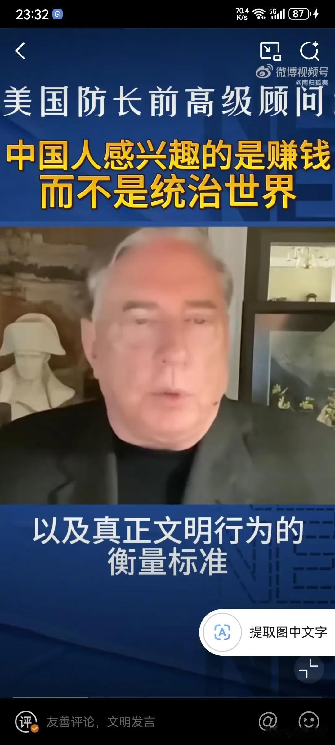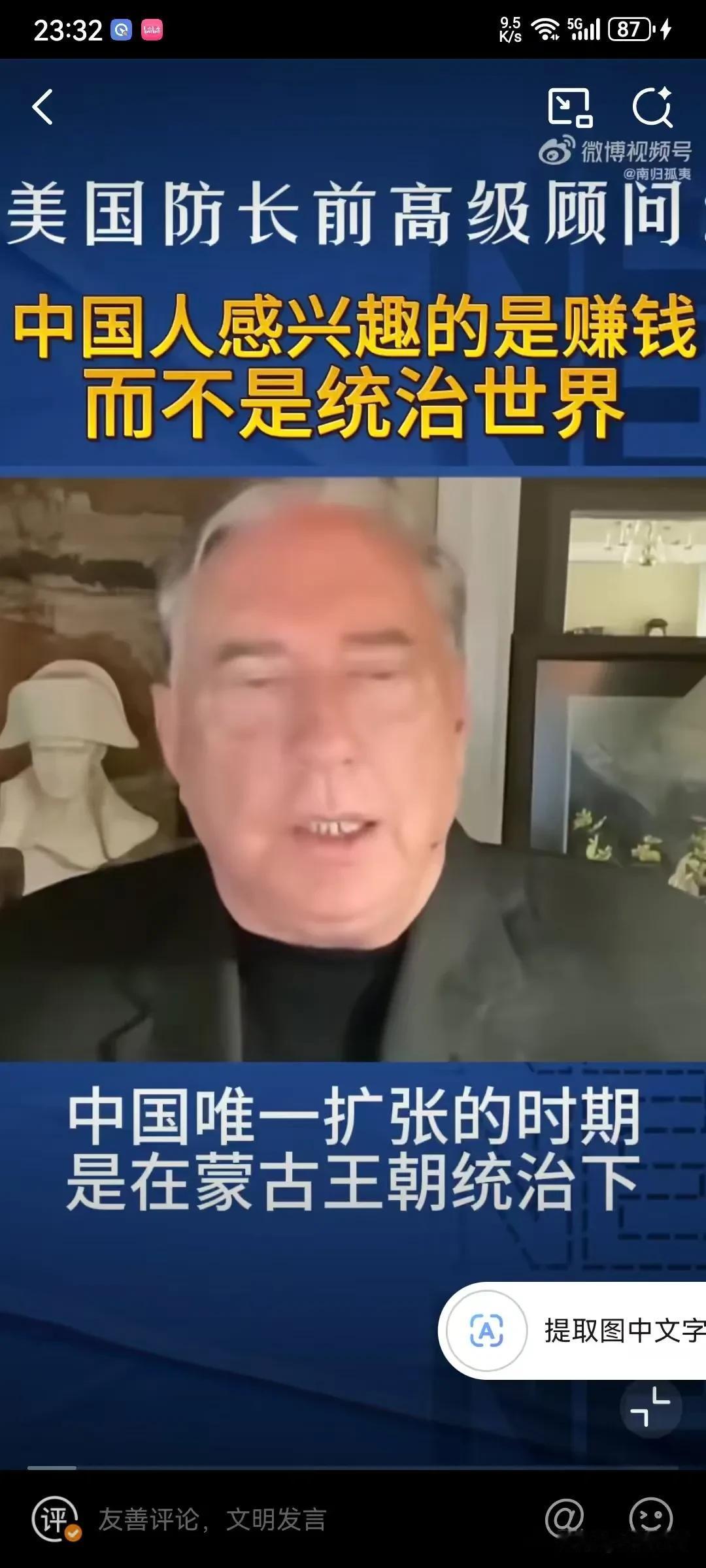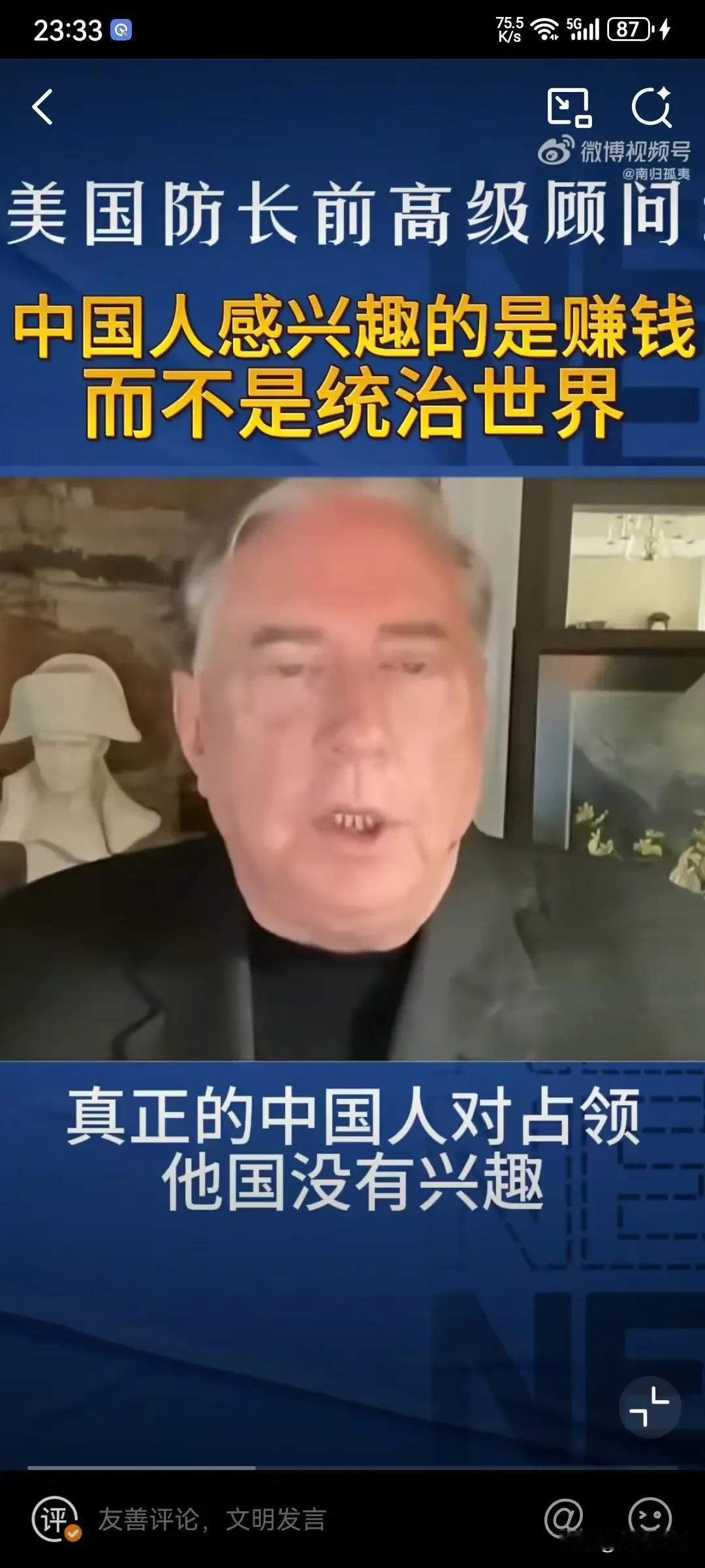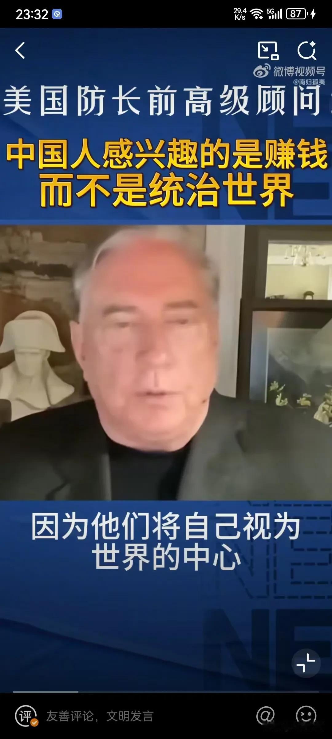 美国专家表示中国人对赚钱感兴趣,对统治世界没有兴趣,因为中国的历史唯一扩张的时期就是元朝,其他的时间都对其他地方没有兴趣,因为中国人本身就认为自己是世界的中心,所以叫中国,中国人只感兴趣于赚钱和保持繁荣! 这个美国专家还是比较懂中国历史的,其实中华文化并没有侵略性,要不然就不会建长城了,这本身就是一种防御性的思维,从秦朝大一统后,就开始这种这种思维,已经根深蒂固了,并且认为四周都是蛮夷,根本不屑于去占领,而且靠文明来融化,你向往我的文明和发达,你自己慢慢融合进来!就这样发展起来的!