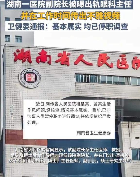 湖南省人民医院这次出丑出大了!全国人民都知道湖南省人民医院副院长出轨眼科主任了! 根据报道,湖南省人民医院副院长出轨眼科主任事件已经被证实,俩人均已经被停职。 令人震惊的是,俩人17分钟的不雅视频地点竟然是在医院值班室,也就是说俩人是在工作时间苟合,工作时间不干正事,令人汗颜。 一个是副院长,一个是眼科主任,还都是专家级的医生,出现这种丑事,已经不仅仅是生活作风的问题,而是公权与私德的双双失守。 他们的无耻之举,既是对双方家庭的伤害,也是对医生道德底线的突破。公权私用违法违规,私德败坏不配担当公职。 对于这样的副院长和眼科主任,绝对不能是停职的问题,该开除党籍、公职的,一律开除党籍、公职。只有严惩不贷,才能以儆效尤。