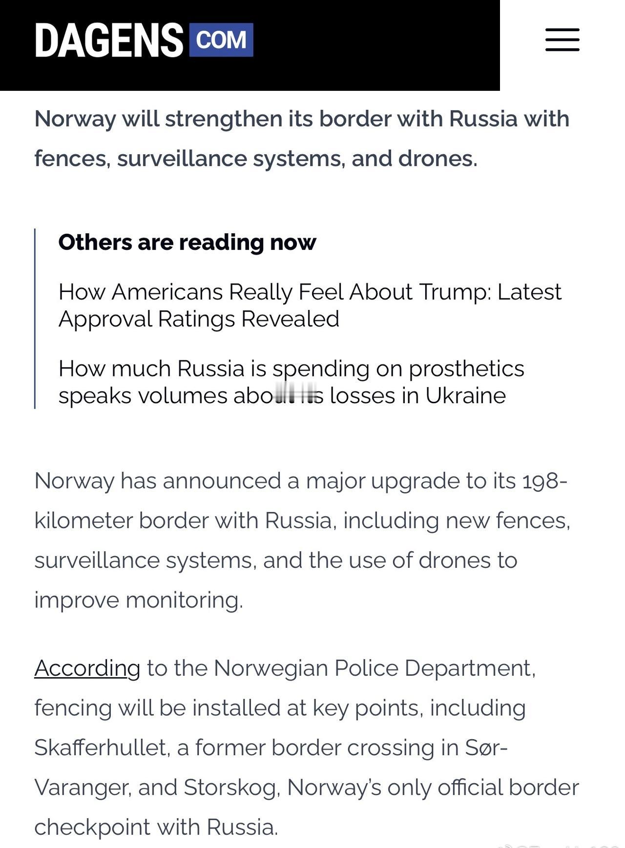 挪威宣布將大規模加強與俄羅斯長達 198 公里的邊界——將安裝新的圍欄、現代化的監控系統和用於空中監控的無人機。