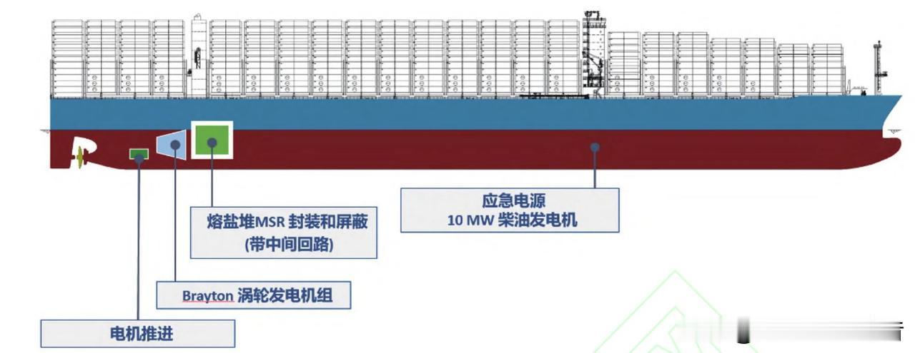南华早报:中国公布使用钍反应堆的全球最大核动力集装箱船! 中国公布了一艘革命性货船的关键细节。这是一艘核动力船,能装载1.4万个标准集装箱。 真正让这艘船“颠覆性”的地方在于动力来源。它将使用基于钍的熔盐反应堆(TMSR),热功率200兆瓦。 这个功率水平与美国海军最先进的“海狼”级核攻击潜艇所用的S6W压水堆相当。 与依赖铀的传统核反应堆不同,后者需要庞大的冷却系统和高压安全壳。新的中国反应堆使用钍,这是一种更安全、更丰富、也更不易扩散的核燃料。 关键在于,这种反应堆不需要水来冷却,使其体积更小、更安静,且从设计上更安全。 如果能成功规模化部署,这项技术可能引发商船业的范式转变。 这艘船的概念在2023年首次披露,但技术细节很少。 钍反应堆核动力货船的蓝图,载箱量1.4万标箱。从左到右的标注依次为“电机推进”“布雷顿循环涡轮发电机组”“熔盐包MSR封装与屏蔽(含中间回路)”“应急电源,10兆瓦柴油发电机”。 10月15日,江南造船集团高级工程师胡可一在中文行业刊物《船与船艇》撰文,披露了关键参数,并解释了中国为何在海上选择钍基熔盐反应堆的战略考量。 胡可一称,反应堆产生的200兆瓦热量并不直接驱动船舶,而是驱动采用布雷顿循环的超临界二氧化碳(sCO2)发电机。这是一种将热能转化为电能效率远高于传统蒸汽轮机的热力过程。 布雷顿循环使用被压缩的气体,这里是二氧化碳,被加热到极高温度后经透平膨胀以发电。超临界二氧化碳同时表现出液体与气体的特性,使系统可紧凑且高效率。 该系统将产生50兆瓦电功率。足以让这艘巨型船只多年横跨大洋而无需补充燃料。为应急,船上还将配备一台10兆瓦级(MWe)柴油备用发电机。 关于核动力船,人们最大的担忧之一是堆芯熔毁或辐射泄漏。但文中称,这台以钍为燃料的固芯熔盐反应堆具有“本征安全性”。 反应堆在常压下运行,消除了高压失稳导致爆炸性压力积聚的风险。 堆芯运行温度约700摄氏度。但由于具有很强的负温度系数,温度上升会自然减缓反应,防止“失控”。 其设有两套被动余热移除系统。包括堆舱内的自然循环冷却系统,以及必要时可将熔盐安全排入屏蔽的被动冷却槽的紧急排放系统。 在最坏情况下,如果冷却失败,熔盐燃料会落入安全腔室并固化。这样能将放射性物质“锁住”,避免广泛污染。 此外,整个反应堆被设计为密封的模块化单元,设计寿命10年。到期后不是换料,而是整体更换堆模块,大幅降低泄漏或人为失误风险。 得益于高温运行与先进的sCO2发电循环,热电转换效率可达45%至50%。相比以蒸汽为工质的传统核反应堆约33%的效率,这是巨大的提升。 胡可一还透露,中国在探索其它核动力船型。包括采用铅铋冷却快堆的苏伊士型油轮,以及使用高温气冷堆的海上浮动核电站。 不过,与用于该集装箱船的钍熔盐反应堆相比,这些方案的功率会更低。 钍不仅更安全,也更丰富。中国拥有大量钍资源,尤其在内蒙古。仅一个矿山尾矿所含钍,就足以按当前能源消费水平为全国供电逾1000年。 美国早在20世纪60年代就于田纳西州的橡树岭国家实验室(Oak Ridge National Laboratory)建成首座钍堆。但项目因技术挑战而中止,其中包括氟化物熔盐对管道的腐蚀。 而中国持续推进,到2025年,中国在戈壁沙漠的钍基熔盐实验堆实现了长期稳定运行这一里程碑,为全球首例。更大规模、具发电能力的示范堆正在建设中。 尽管前景可观,挑战仍然巨大。胡可一写道,“核动力商船的资本成本预计将显著高于常规船舶”。 关键的财务与运营障碍包括,高昂的前期建造成本。因风险认知而难以获得私人融资,针对海上核事件的保险覆盖有限。以及反应堆维护、乏燃料处理、退役与专业船员培训等持续开支。 虽然核燃料本身廉价且价格稳定。胡可一指出,经济可行性取决于长期燃料节约能否抵消巨大的初始投资与运营复杂度。 他写道:“商船项目可能需要政府支持或担保。单靠私人公司无法承担如此庞大的建造与运营风险。”