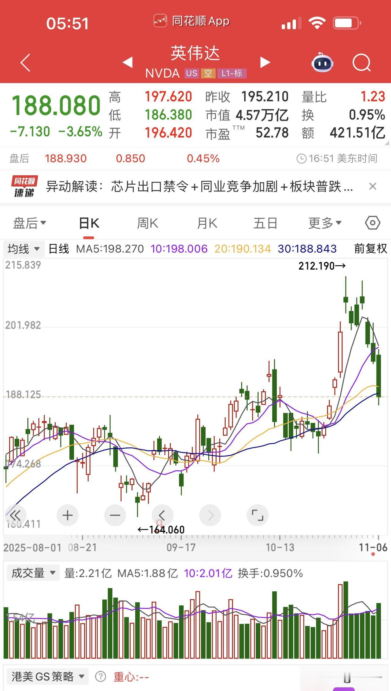 美股收盘英伟达领跌大型科技股, 存储芯片方向美光科技高位十字星、 闪迪盘后大涨、西部数据和希捷红盘报收; 特斯拉机器人一直难产, 说好的新机发布一拖再拖, 小鹏机器人唱主角, 美股小鹏大涨9.64%; 公布财报的百济神州继续大涨, 高位横盘的阿里巴巴表现都不错, 中概股今晚扬眉吐气! 黄仁勋是郁闷的, 白天一顿吹捧“中国Ai将赢得竞赛”, 把寒武纪和海光信息送上王座; 我们都知道黄仁勋想打开中国Ai芯片销路、 同时让白宫解除芯片出口限制, 结果晚上白宫变本加厉限制Blackwell对外供应, 股价重挫3.65%, 哎,谋事在人、成事在白宫呀! 老黄不哭! …