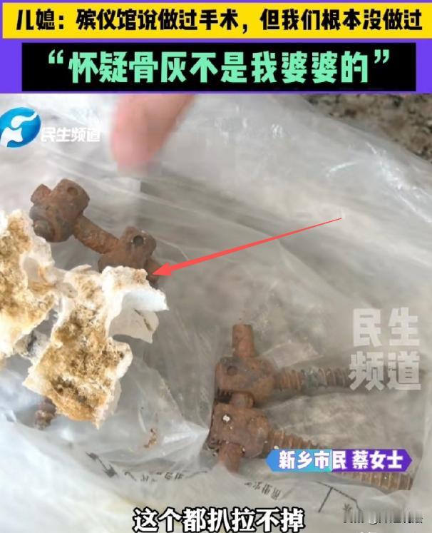 河南新乡,一位婆婆去世火化后,女子和丈夫去捡骨灰时,发现骨灰里竟有四个大钢钉。女子十分纳闷,婆婆生前没做过手术,核磁检查也没发现体内有金属。她怀疑这骨灰不是婆婆的,无法让老人下葬。殡仪馆工作人员坚称从遗体到骨灰有完整闭环,肯定是女子婆婆的。双方查看监控,关键视频却缺失,殡仪馆解释让女子难以接受。 蔡女士90岁的婆婆,在2025年10月因病离世。 按当地习俗,家人很快把老人送到了殡仪馆,流程进展顺利,就等着领骨灰让老人和公公合葬。 葬礼本该是让逝者安息、生者慰藉的仪式,原本平静的送别,在捡骨灰那一刻被打破。 蔡女士在捡骨灰时,发现腰椎骨上嵌着两颗大钢钉,另外两颗因烧灼变形掉落在骨灰里,这让蔡女士懵了。 她照顾婆婆多年,对婆婆的身体状况了如指掌,老人身上没有疤痕,也没有手 术 史,之前做核 磁 检查时也没发现体内有金属物。 这突如其来的情况,让蔡女士认定骨灰有问题,她赶紧把这事告诉了家人,全家人都觉得是殡仪馆弄错了遗体。 原本计划好的葬礼被搅得一团糟,老人至今无法入土为安。蔡女士找到殡仪馆的工作人员,要求他们给个说法, 殡仪馆的工作人员却坚称全程闭环管理,用的是捡灰炉,炉床单独,还有监控记录,肯定不会出错,骨灰就是蔡女士婆婆的。 蔡女士哪能轻信,她要求查看监控,想弄清楚到底哪个环节出了问题。 可当他们查看监控时,却发现捡骨灰环节的画面缺失了,殡仪馆给出的解释是监控线路老化没录上。 蔡女士对这个解释无法接受,她反驳说,仅凭这个解释根本无法证明抬进炉子的就是婆婆,毕竟,没有监控画面,谁也不知道当时到底发生了什么。 殡仪馆的态度让蔡女士一家不满,他们觉得殡仪馆在推卸责任,没有认真对待这件事。 蔡女士说,婆婆辛苦一辈子,现在走了,却不能好好安葬,这让他们做子女的心里实在难受。 为了弄清楚真相,蔡女士报了警。她希望通过调查找到事情的真相,殡仪馆也建议走司法途径,让法律判。 蔡女士每天都在想,到底什么时候才能弄清楚骨灰到底是不是婆婆的,老人一直等着入土为安,可现在却因为这件事被搁置。 蔡女士说,她不图别的,就想要一个真相,如果骨灰真的是婆婆的,那这些钢钉是怎么回事?如果不是婆婆的,那婆婆的骨灰又在哪里?这些问题一直困扰着他们,让他们寝食难安。 殡仪馆收钱办事,就得保证火化流程不出错,现在骨灰里多出四颗钢钉,家属质疑搞错遗体,这就涉嫌违约。 依据《民法典》第1183条,侵害自然人人身权益造成严重精神损害的,被侵权人有权请求精神损害赔偿。 蔡女士一家发现骨灰异常,若最终查明是殡仪馆失误导致骨灰弄错,这无疑侵害了蔡女士一家对婆婆骨灰的特定身份权益,造成严重精神损害,殡仪馆应当承担精神损害赔偿责任。 殡仪馆称监控画面缺失,依据《殡葬管理条例》,殡仪馆等殡葬服务单位应当建立健全各项规章制度,加强内部管理。 监控作为保障服务质量和安全的重要手段,缺失可能影响对服务过程的监督和追溯。依据法律规定,可以对殡仪馆在管理上的漏洞进行行政处罚,督促整改。 殡仪馆属于服务机构,有义务提供符合约定的服务。现在关键环节监控录像缺失,等于自断证据链,证据拿不出来,就得承担不利后果。 《民事诉讼法》第64条规定“谁主张,谁举证”,但殡仪馆作为管理方,应妥善保存监控录像。 若因设备故障导致关键证据缺失,根据《最高法关于民事诉讼证据的若干规定》第95条,可推定殡仪馆未尽到管理职责,需承担不利后果。 如果因殡仪馆失误导致错过婆婆最佳下葬时间,从法律角度看,这属于因一方过错给对方造成损失的情况。 依据《民法典》第577条,当事人一方不履行合同义务或者履行合同义务不符合约定的,应当承担继续履行、采取补救措施或者赔偿损失等违约责任。 殡仪馆需采取补救措施,如协助安排合适的下葬时间等,对蔡女士一家因此遭受的损失,如额外产生的费用等进行赔偿。对于错过最佳下葬时间造成的损失,殡仪馆也要承担相应赔偿责任。 蔡女士一家每天都在盼着,盼着能早日弄清真相,让婆婆安心下葬,他们不知道还要等多久,但他们不会放弃,一定要为婆婆讨个说法。