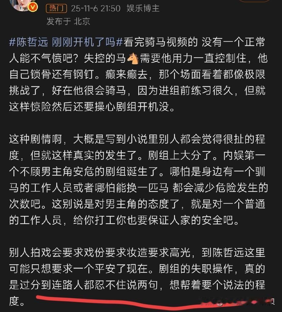 陈哲远又上热搜了! 好像是因为在拍摄江山为聘的一段骑马戏时,马看起来有点烈性,导致他拍摄结束后,露出了痛苦的表情。 粉丝看到后,一边痛骂剧组没人性,一边发精修骑马帅照,在热搜上铺陈宣传。 也是蛮有趣的。 甚至还有大粉说,希望以后多拍点一笑随歌那样的剧。 真的是让人哭笑不得! 看来在粉丝眼中,陈哲远只要以后的剧,都达到一笑随歌那样,云合最高不过15的播出成绩,就很满意了。 这个要求确实不算高。[笑哭]