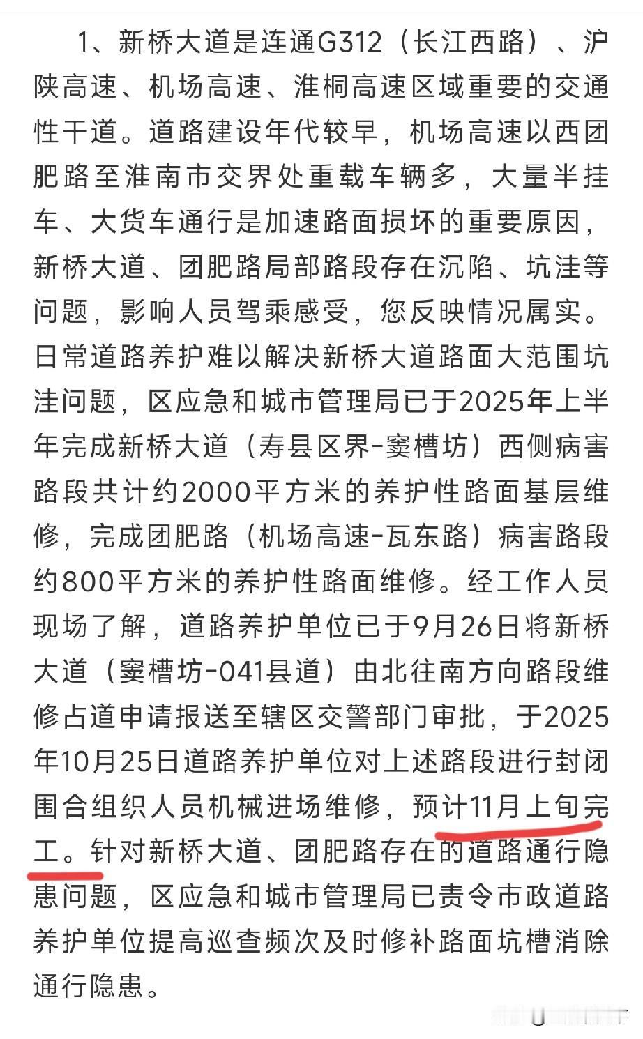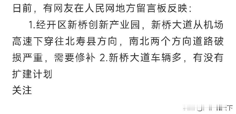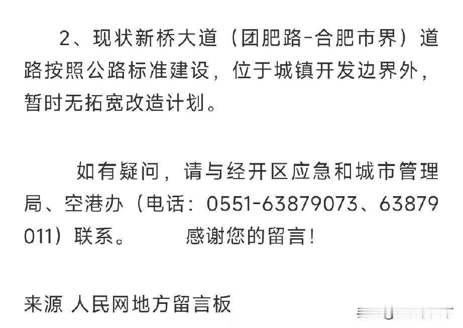 涉及合肥和寿县两地的新桥大道,目前没有扩建改造计划 寿县属于合肥都市圈辐射范围之内,其中炎刘镇的新桥新城,与合肥经开区交界,两地来往的主要交通干线就是新桥大道,新桥大道有寿县段和合肥经开区段。 有网友在人民网地方留言板咨询,新桥大道路面破损严重,需要修补,新桥大道车辆多,有没有扩建计划? 合肥经开区回复:道路养护单位,正在进行维修,预计11月上旬会完工,新桥大道(团肥路-合肥市界)位于城镇开发边界外,暂无扩宽改造计划。寿县产业升级 新桥新城 新新桥 长丰大道 新桥进度