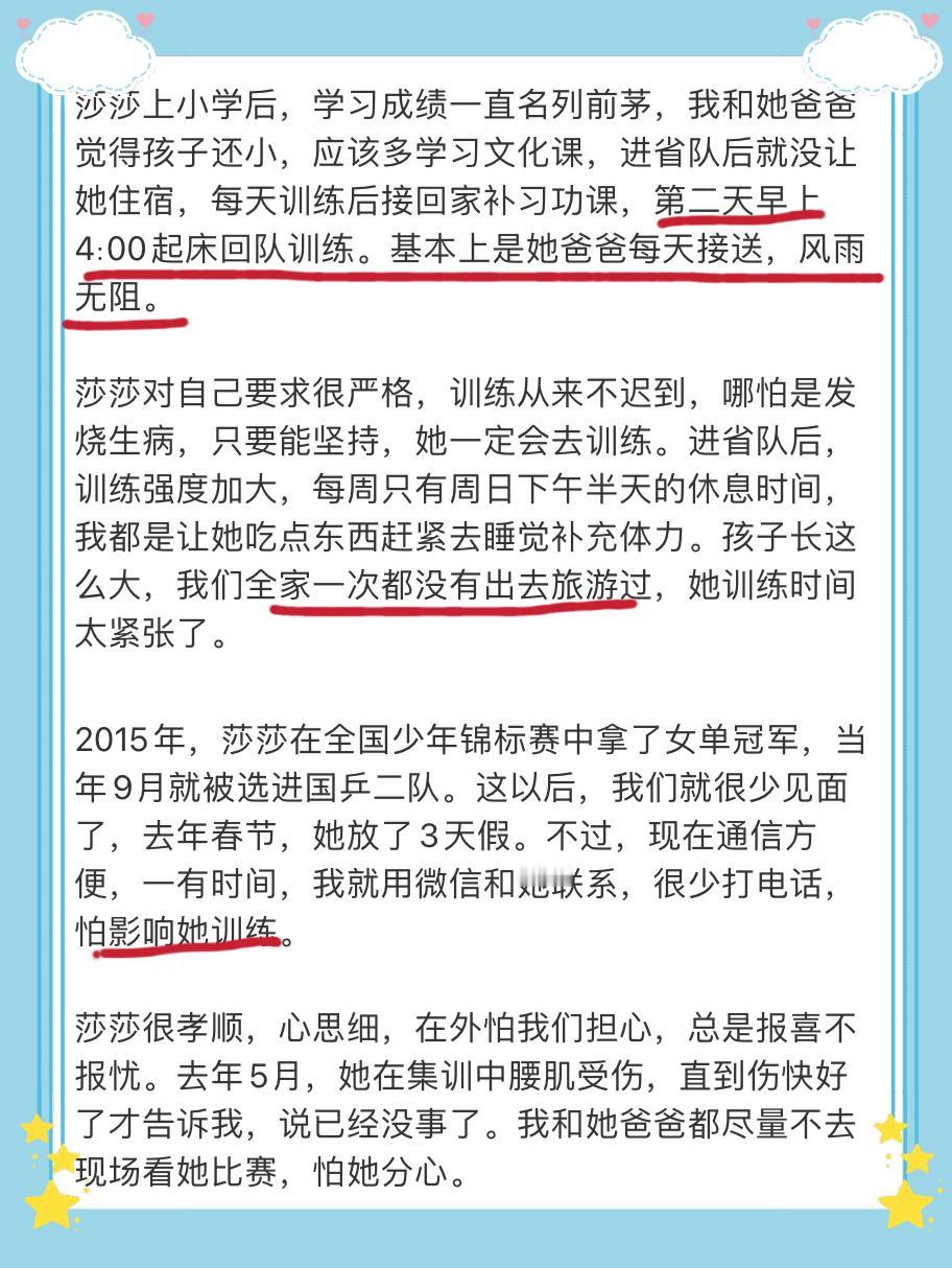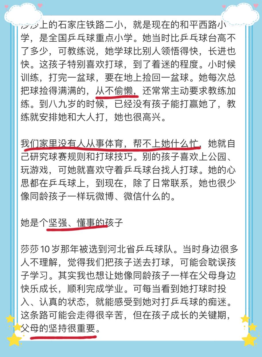 感动!莎莎和爸爸妈妈的合照好温馨,莎莎是在爱里长大的孩子。 看到莎莎生日时候和妈妈爸爸在一起的合照, 多看几眼,还是被这一幕感动了。 莎莎很少很少会把爸妈放到镜头前,莎莎这么大的热度和流量, 爸爸妈妈也都是在背后默默支持,从来不出来讲什么。 莎莎长高了, 我们经常看到的合影,还是莎莎小时候的, 现在一看,真的长大了,和妈妈一样高了, 和妈妈长得也很像。 印象中妈妈一直是这个样子,没有变, 但是爸爸比以前看起来要老了一点点, 但是这种精气神和以前一模一样, 人,骨子里的东西,性格决定的感觉, 是不会变的。 妈妈轻轻的搂着莎莎的腰,这一刻妈妈是最幸福的。 爸爸把手搭在莎莎的肩上,在莎莎的心中, 爸爸这双手的力量是他的底气吧。 在经历了这么多,还如此阳光明媚, 一直有勇往直前的劲头, 永远以国为大, 爸爸妈妈的爱,爸爸妈妈的教育和思想, 相信也给了莎莎无尽的力量。 爱,才是底气,才是勇气! 无论发生了什么,爸爸妈妈为你撑起的家,为你撑起的伞, 永远是你敢奔跑的底气! 这是妈妈以前的一段采访, 也只能找到这一段了。 莎莎5岁正式开始打乒乓球,那时候爸妈没时间接送她,就让爷爷来,爷爷每天骑三轮车接送,平均每天是4趟。 喜欢打球,别人都在玩,她就想打球。 10岁进入河北省队,其实也有很多人给他们父母说,这么小送去打球耽误孩子学习, 但是爸妈看到她真的喜欢,也不忍心不让她去。 这条路会很辛苦,父母的坚持也很关键。 因为孩子小,也不想让她耽误学习, 所以莎莎进入省队之后,也在家里住, 爸爸早上4点起床送她回队训练,晚上再把她接回来。 妈妈说,莎莎小时候他们一次也没有出去旅游过,她训练时间紧,我们也怕耽误她训练。 绝大多数人,每个人的成长之路都不轻松, 相信不只是莎莎, 其他人也一样, 但是每个家庭的教育和思路不同, 她的成长轨迹,思想高度也会不同! 孙颖莎的人格魅力,她的格局,也验证了她的原始家庭教育! 致敬每一位把孩子交给国家的父母,都不容易!