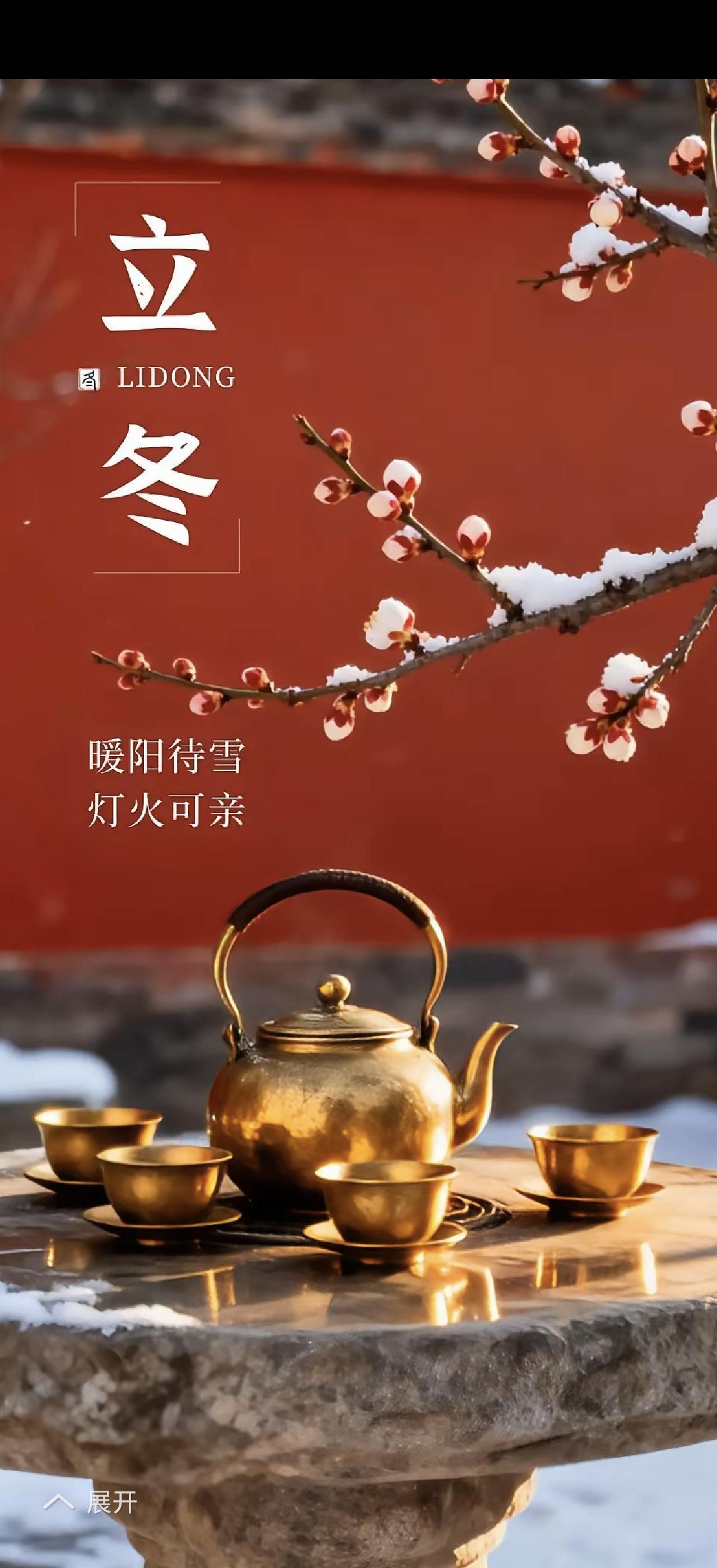 立冬到了,天地有了初寒之意。风里添了清冽,落叶卷着秋意悄悄退场。 立冬是冬天第一个节气,意味着万物闭藏休养。在这寒冷却温柔的季节,有别样风景。南方似小阳春,橘绿橙黄、红日艳阳;北方则是万瓦霜华、寒梅飘香。 此时,约上三两友人围炉煮茶再好不过。一边暖火温汤,一边感叹时光匆匆。立冬不是结束,而是“休养生息”的开始。盼一场瑞雪,等一个崭新开端,愿冬来安康,岁岁无恙。