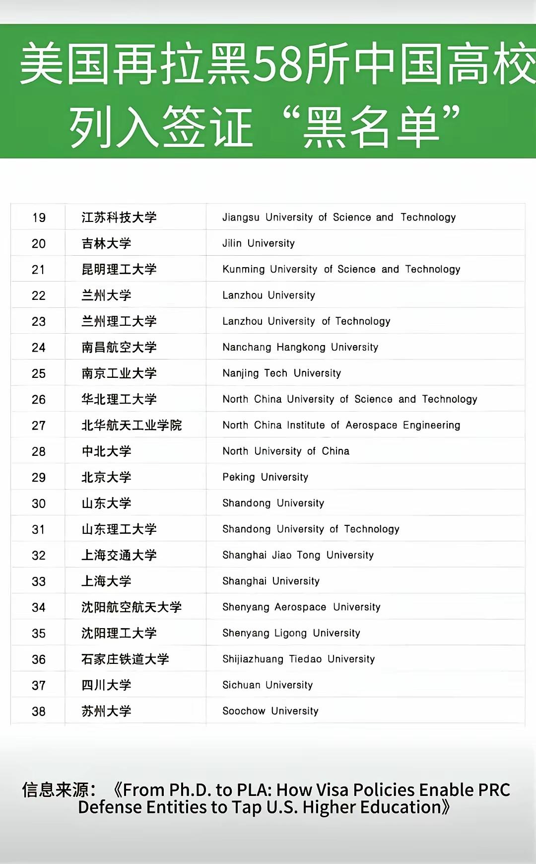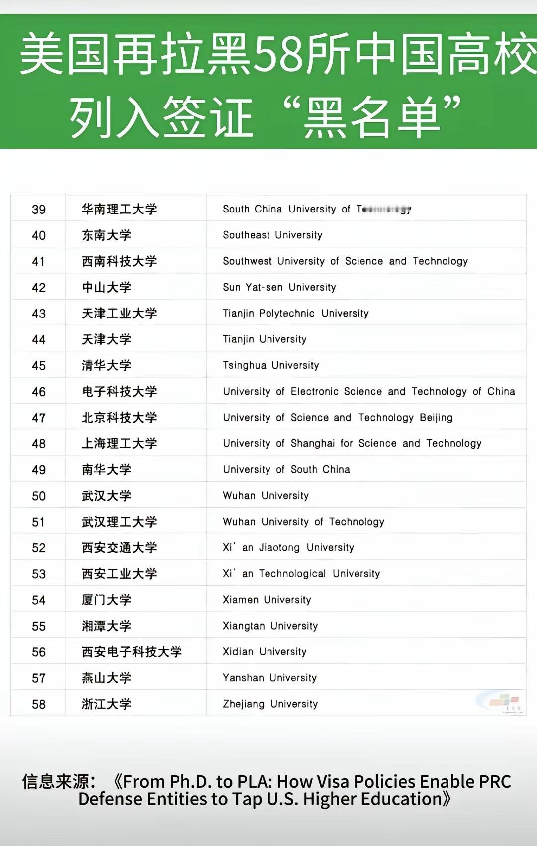 黔驴技穷,再拉黑58所中国高校,列入签证“黑名单”,其中18所985、9所211、31所“双非”高校。 中国高校的教育发展,中国人才培养目标,中国科技的进步和崛起,是拉黑所能阻止的。 相互交流,能促进科学技术的进步;独立自主,更能体会到中国科技的创新。 拉黑的方式,真的很低级。
