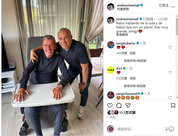 伊涅斯塔社媒晒出与温苏埃的合照,配文:“畅谈生活与足球的时光总是如此美妙,你真的很了不起,朋友。”
