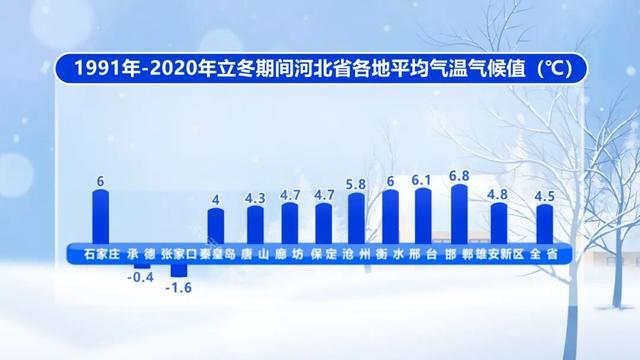 具体到省内各地市,张家口、承德地区在立冬时节的平均气温已在冰点之下,分别为-1.6℃和-0.4℃;其他地区则在4~6.8℃之间。